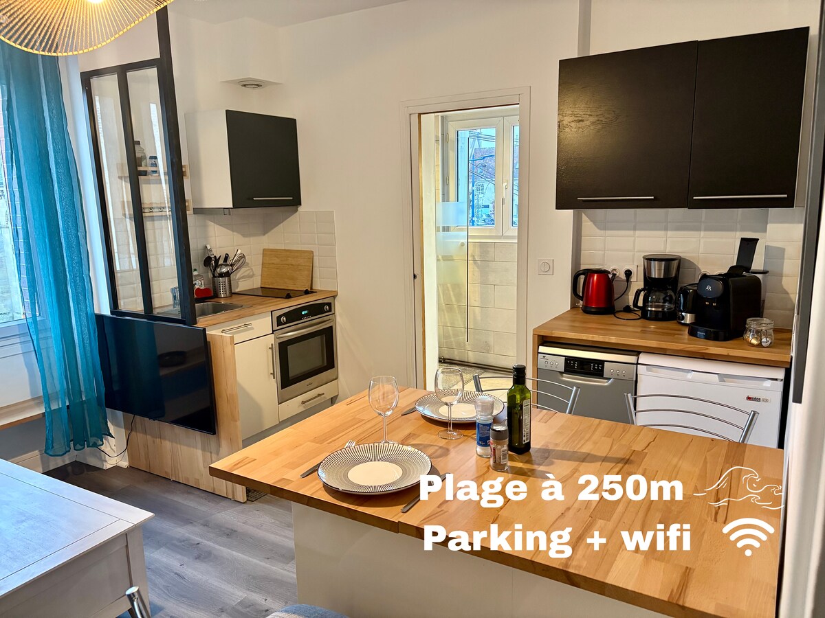 Dépaysement assuré dans ce logement à la décoration rétro années 40. Très lumineux avec vue sur mer et la rue principale. La plage, restaurants, commerces et marché aux poissons à moins de 200 mètres. Parfait pour découvrir les sites du débarquement et/ou profiter de la mer. Equipement moderne avec télé et micro-onde malgré le style vintage! Résidence calme. Place de parking privé. Lit parapluie et baignoire bébé à la demande.