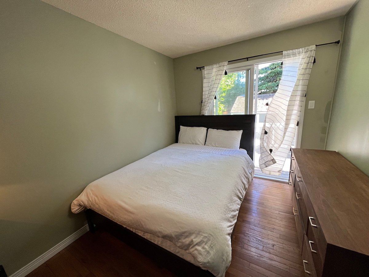 This is a modern, spacious, private home with 2 bedrooms upstairs, 1 bathroom upstairs & a 1/2 bath on main floor. Upstairs bathroom has a large tub perfect for relaxation as well as a walk-in shower. This well-equipped home is in a fantastic neighborhood with parks & grocery shopping nearby & only a few minute drive from the airport. Home also has a large fenced in backyard (perfect for dogs) with a deck & patio furniture. There is a basement, but it is a concrete unfinished basement.