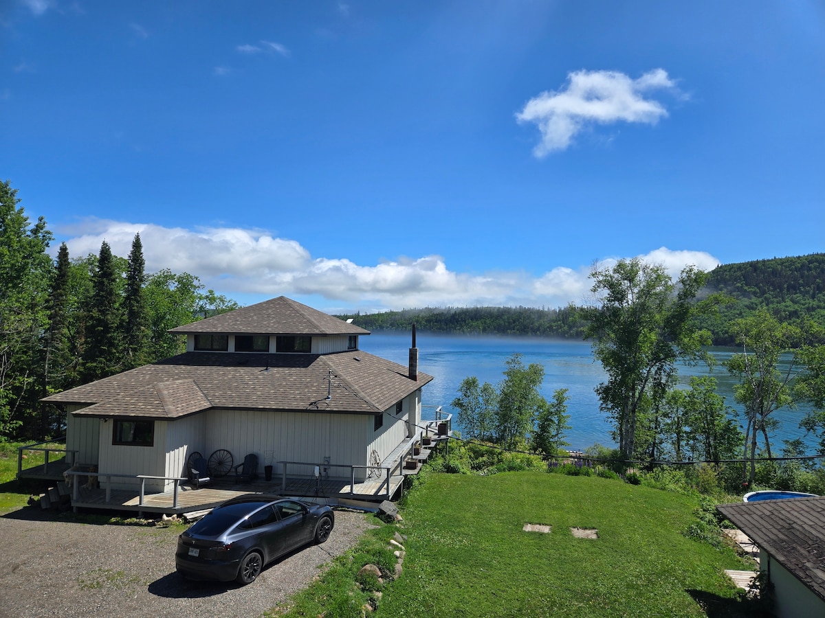It’s a peice of country paradise just a 20 min drive to downtown Thunder Bay you have a beautiful bachelor suite with tv, fridge stove, fireplace ,dishwasher ,full arcade room with arcade machine, and a pool table full professional gym. Walkout the patio door to a hottub and sauna waterfall ,outdoor firepit ,sand volleyball court, badminton ,basketball court and pickle ball court lake for swimming With a dock to jump off With hammock , fireplace pet friendly has washer/dryer