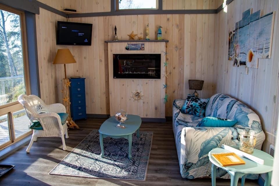 Pick all the experiences! Get cozy by the fireplace in the cabin themed living room. Read a book on the comfy red couch in the relaxing sitting room. Shake a cocktail while listening to Jimmy Buffet in the sunroom bar. Let the flames of a bonfire enhance your stories around the beautiful lake view fire pit. Grab a towel and kayaks then walk across the road to the beach! If you’re looking for an adventure or a tranquil getaway, this 2 bedroom house by the beach is your home away from home!