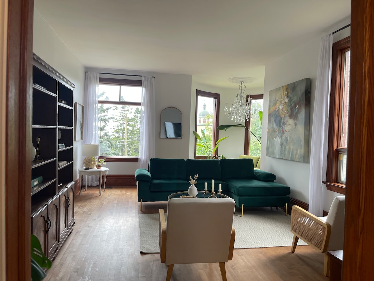 This unique place has a style all its own. Steps away from the law school! This newly renovated upper unit with all new furnishings features a bright luxe interior. 1Br w/ yoga and/or meditation corner. Stunning full bath w' jetted-tub. Bright & spacious living & dining area. Fully stocked kitchen w' dining for 4. Enjoy the ambiance of your electric fireplace in any season. Treat yourself to a bubble bath in the jetted tub. Book today!
