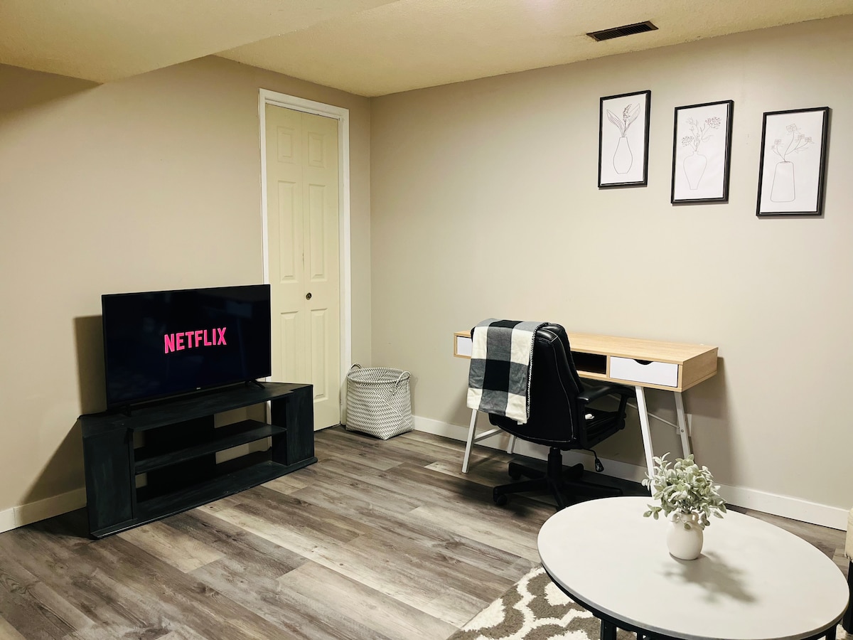 Enjoy your stay in a newly renovated basement apartment with a sauna, separate entrance, and large living room. Included is a double bed, pull-out couch, large walk-in shower, fireplace and laundry machines. Located a 5 minute drive from the airport on a quiet round-about street. A few minutes from many fast food restaurants, grocery stores and all other amenities. Street parking is available.