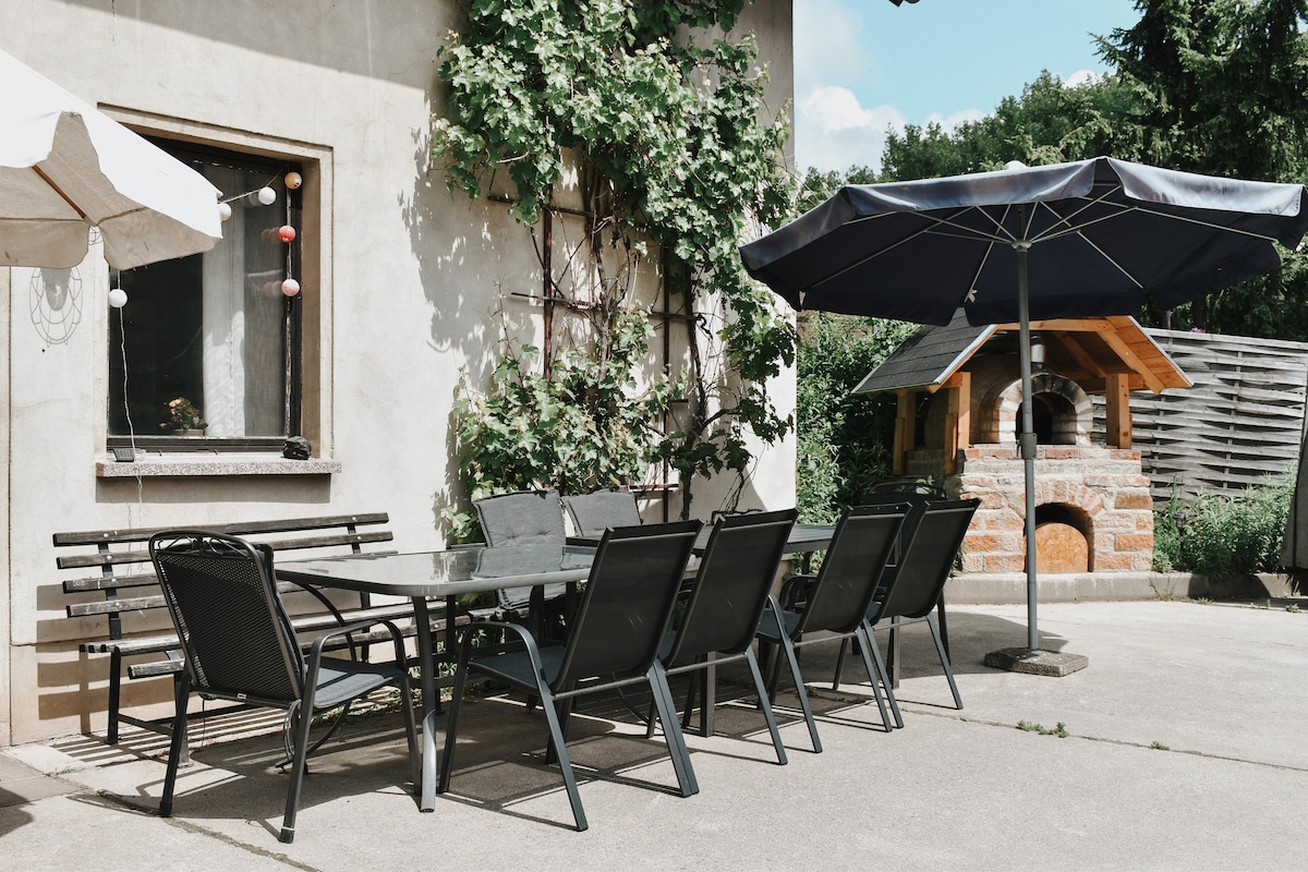 Haus über Weimar, fernab vom Trubel der Stadt. In unserem kleinen liebevoll gestalteten Backsteinhaus, direkt am Weinberg, in unserem großem parkähnlichen privaten Grundstück kann man die Seele baumeln lassen. Der Tag kann mit einem Frühstück und einer guten Tasse Kaffee, zB. bei Sonnenaufgang auf der Terrasse mit herrlichem Fernblick beginnen. Das Schlafzimmer mit großem Doppelbett befindet sich oben in der Galerie. Unser Hofhund Cleo ist gut erzogen und empfängt freudig alle Gäste.