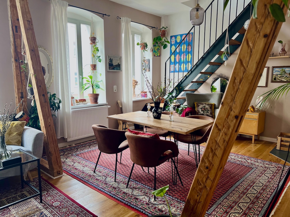 Nestled in the idyllic setting of the Thuringian Forest, our 70 m² forest loft with 30 m² terrace offers a picturesque retreat for artists, couples and free spirits. Let yourself be lulled to sleep by the crackling of the fireplace and awakened by the chirping of birds. Whether for creative inspiration, romantic moments or exploring nature - you'll find the perfect place for your time-out on our 2000 square meter property.