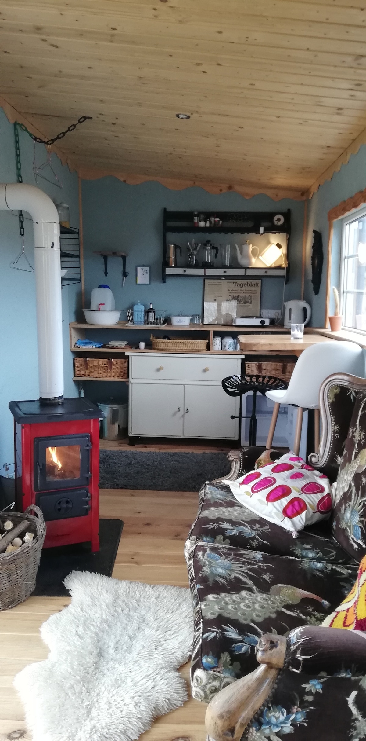 Holzhaus 13 qm inmitten unseres großen Obstgartens mit Miniküche, Holzofen, Plumpsklo und Solarstrom. Es gibt 2 Betten, die als Doppelbett oder Einzelbetten gestellt werden können. Bewußt einfach gehalten, kein TV und WLAN, dafür jede Menge RUHE und NATUR. Der Garten mit Liegeschaukel, Feuerstelle und Tipi (im Sommer) steht zur Verfügung. Das Wohnhaus ist 30 m entfernt und dort gibt es ein Duschbad, das von 7.30 bis 22 Uhr genutzt werden kann und wo das schmutzige Geschirr abgegeben werden kann.