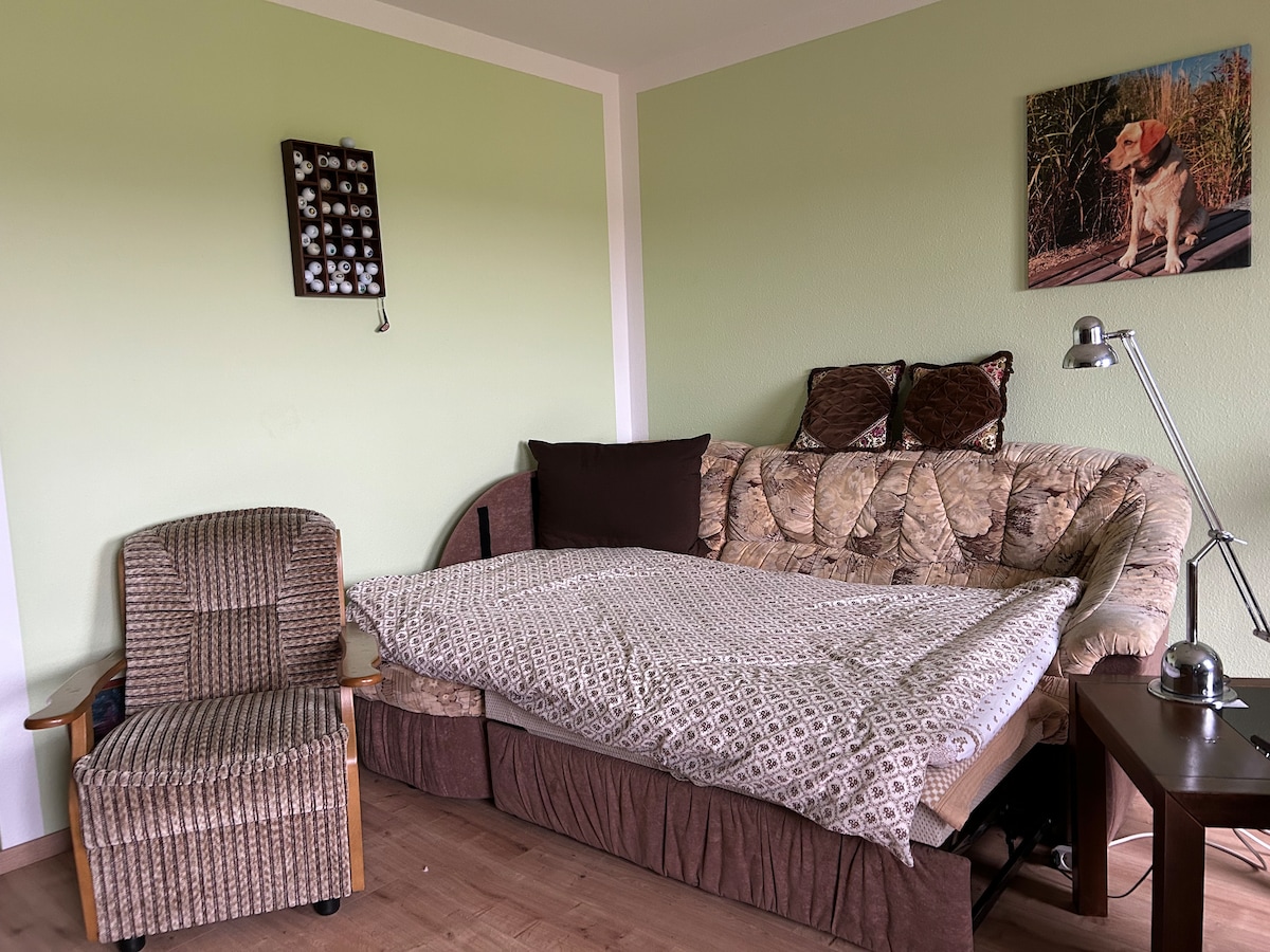 Hallo und einen schönen Guten Tag . Meine Unterkunft zentral gelegen und trotzdem zum entspannenden Verweilen einladend, bietet alles was das Herz begehrt. Sie nutzen für sich allein Wohnzimmer (Couch bietet Platz für eine Person) Schlafzimmer (Doppelbett), Küche, Bad mit Dusche & WC und Terrasse, Garten sowie eine gemütliche Sitzecke im Hof. Kostenfreie Stellplätze vor dem Haus. Leipzig ist 40 km, Halle 20 km und die schöne Goitzsche 15km Grieche im Ort WLAN vorhanden , 2 Fahrräder & Grill