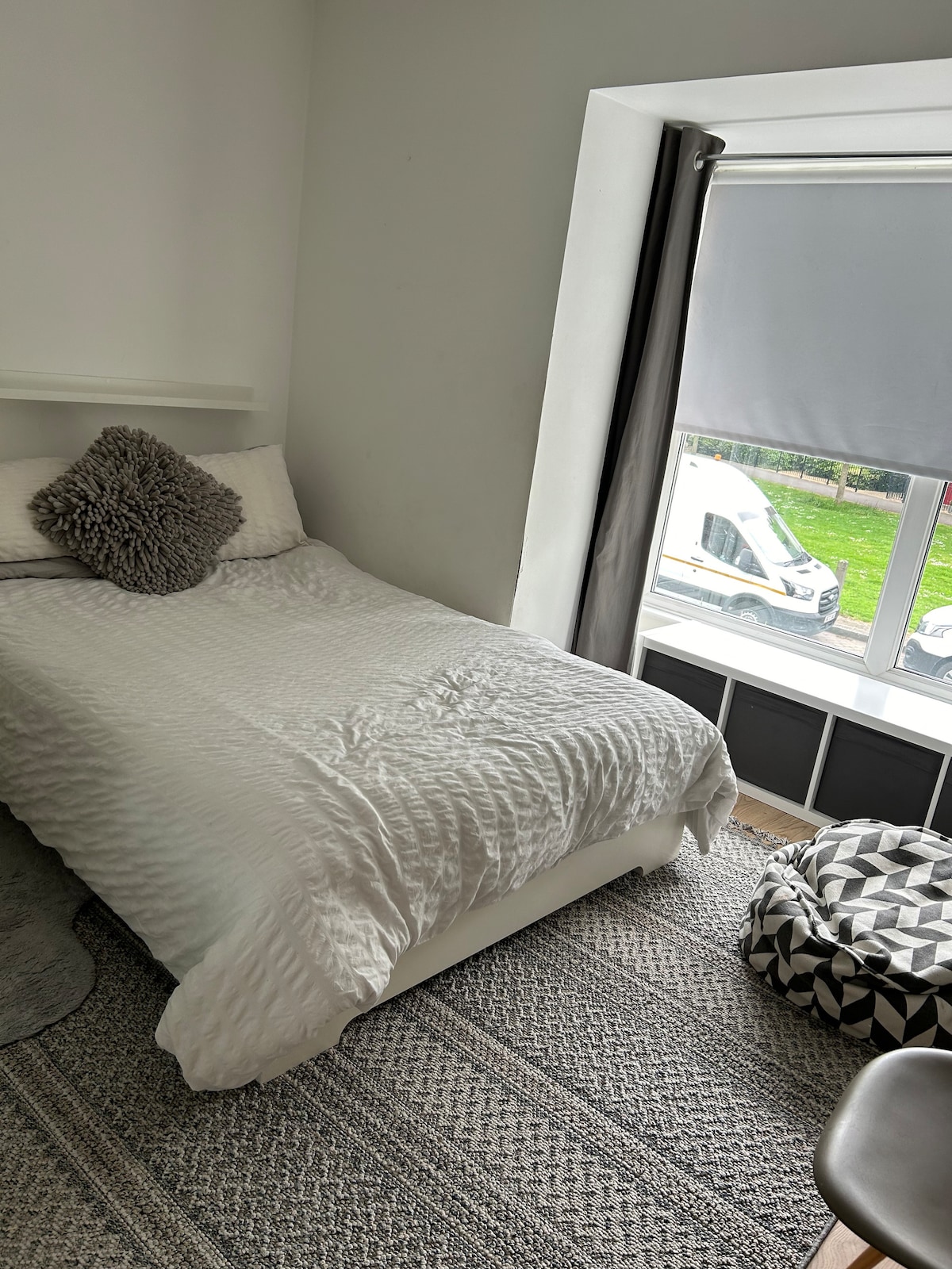 Feel right at home, kick back and relax in this calm, peaceful and stylish space. The spacious two-bedroom apartment is light, bright and full of natural light with cleaning kept to a high standard. Your spacious bedroom comes with a king-sized bed and a private bathroom. Shared living room and kitchen with full use of all the kitchen appliances including the washing machine. Free off-road parking is available.