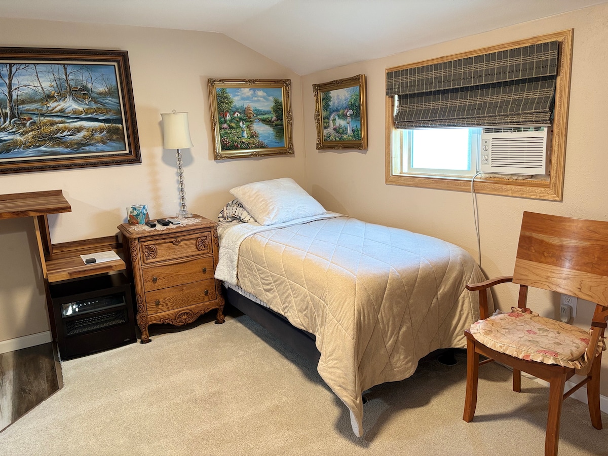Our English-style suite, upstairs over our detached garage, seems a world away. Pure cotton linens, down comforter, good lighting, cosy chairs, and tasteful decor make this an ideal place for retreat or business trip. Microwave, refer, coffee maker. Private bathroom with shower, no bathtub. The stairs to this room are quite steep and narrow. If you are at all challenged by stairs we would suggest you consider our other room, the Cabin Retreat, on the ground floor.