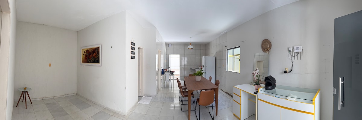 Bem arejada! A 3,5 Km do Parque Nacional de Ubajara. Cama para 13 pessoas. 03 suítes + 01 banheiro social, entradas independentes. Chaves individuais. Portas p/ todos os lados. Circulação completa no exterior, isso faz com que mesmo que a turma seja grande, todos se sintam confortáveis individualmente. Próxima à praça do Castelo Clube, lugar tranquilo p/ crianças. Venha c/ família, amigos, agregados e pets. Basta trazer roupas, agasalhos, meias, objetos de uso e higiene pessoal - o mais terá.