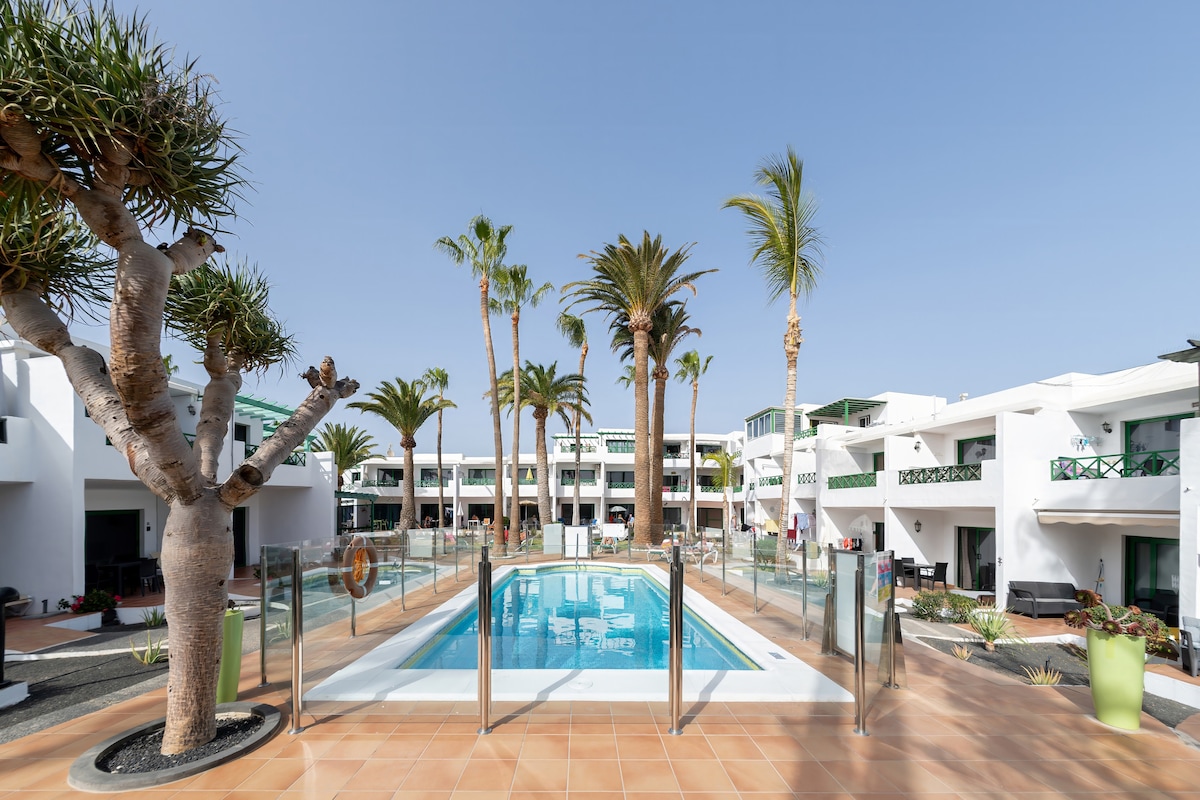 Apart. new, bright, overlooking the sea in one of the best areas of Puerto del Carmen. The terrace is great for breakfast or dinner watching the sea and pool. With all the amenities: Wiffi, air conditioning ,, safe, dishwasher, washing machine, fridge freezer, TV 50 ", kettle, coffee maker, utensils (pots, pans, dishes, cutlery, ...), pool Children + adults, playground, private parking. Bars, restaurants and large supermarket at 300 meters. Chica beach at 500 meters.