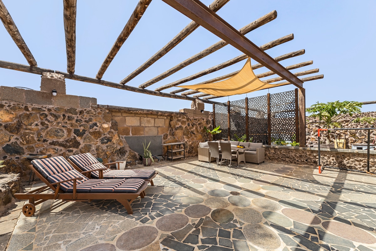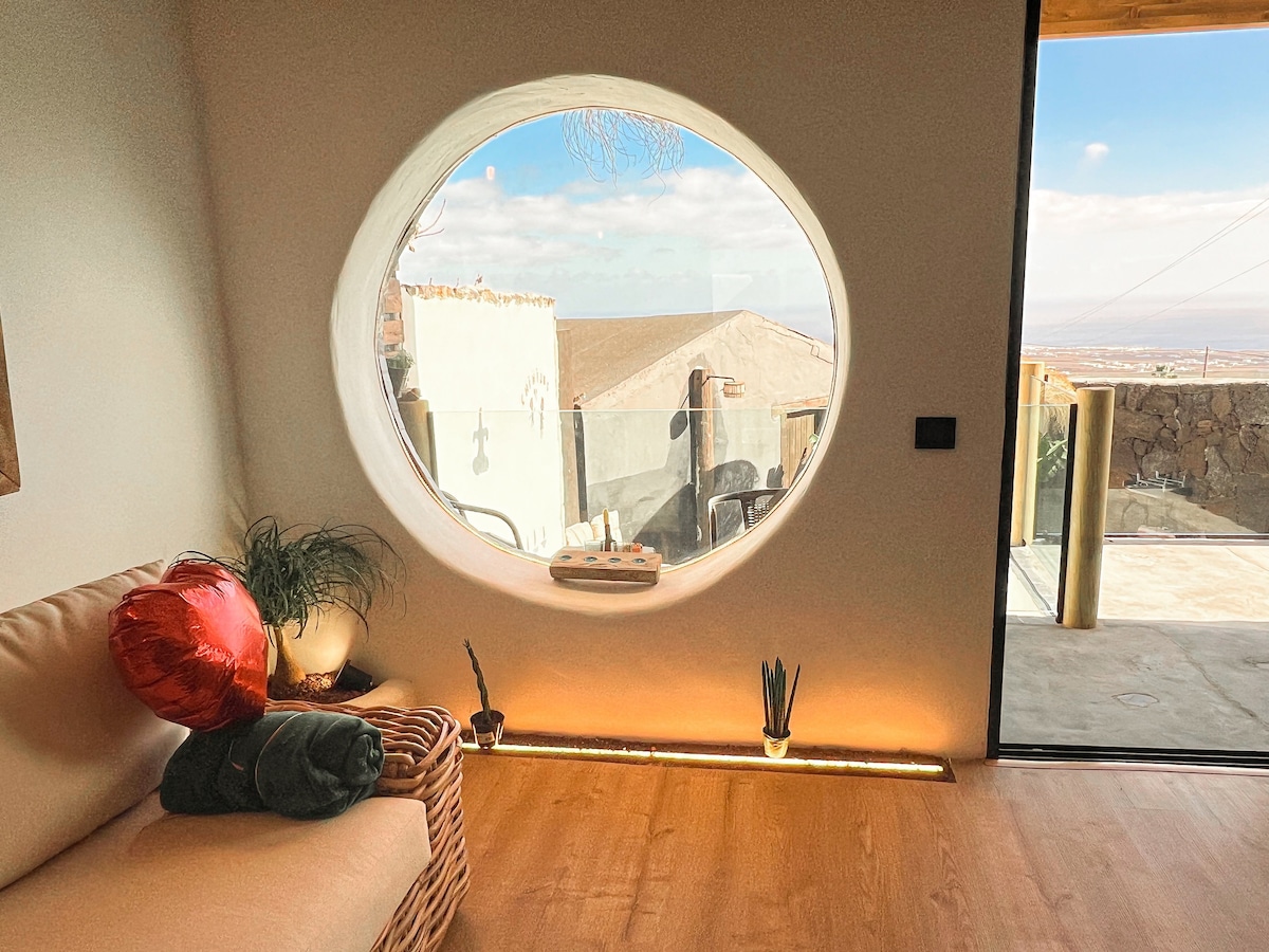Stay in one of two charming 80 sq m modern hippie apartments with a unique view of Timanfaya National Park and its volcanoes. The apartment features a fully equipped kitchen, a living room with panoramic sliding doors and a sofa bed, HDTV, fiber optic internet, and a bedroom with a Canarian-style en-suite bathroom. Relax on your private terrace, dip your toes in the César Manrique saltwater pool, enjoy the endless vistas, and marvel at magical sunsets. 🩵
