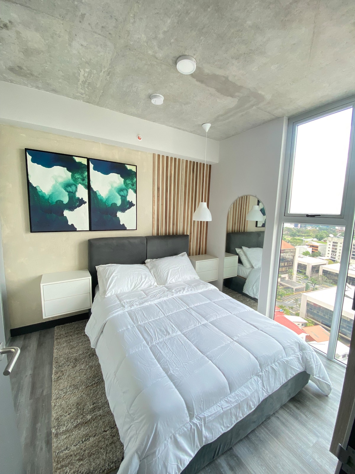 Brand new luxury apartment at Nucleo Sabana. It has a minimalist style with all the appliances brand new, including A/C, 2 smart TVs. High speed internet with TVservice. Laundry room includes a washer/dryer, 2 in 1. It has a wonderful view to the top of the trees and the sky in the balcony. There is a river next to it so you can always enjoy the river sound. Complex: More than 30 amenities, including a gastronomic market(NucleoGastro). Located 10min from Juan Santamaría Int’l Airport (SJO).