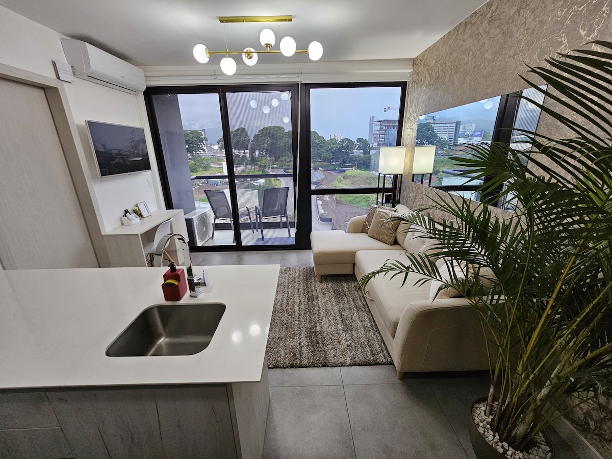 Embrace comfort in this centrally-located 1-bedroom condo, just 15 minutes from San José. From the 12th floor, enjoy stunning sunrise views over the city and mountains. The interior boasts high-speed WiFi, state-of-the-art kitchen appliances, elegant decor, and a plush bed for ultimate relaxation. The building offers an impressive array of amenities, including a semi-Olympic pool, saunas, gym, co-working space, fire pits, game room, and rooftop terraces with panoramic urban views.