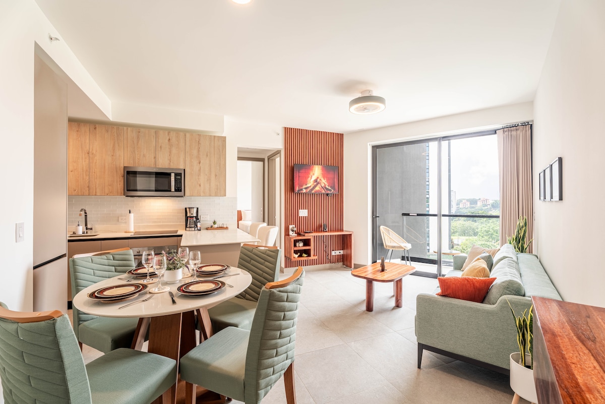 Brand new luxury apartment at Nucleo Sabana. It has a minimalist style with all the appliances brand new, including A/C, 2 smart TVs. High speed internet with TVservice. Laundry room includes a washer/dryer, 2 in 1. It has a wonderful view to the top of the trees and the sky in the balcony. There is a river next to it so you can always enjoy the river sound. Complex: More than 30 amenities, including a gastronomic market(NucleoGastro). Located 10min from Juan Santamaría Int’l Airport (SJO).