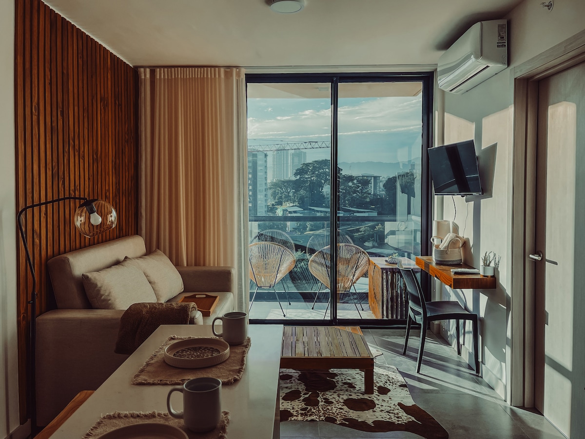 Relájate y disfruta una experiencia con estilo Japandi. Escucha los pájaros y contempla las montañas al amanecer, vive los mejores atardeceres y una increíble vista nocturna, todo desde nuestro balcón! Ubicado en nueva y lujosa torre con modernas amenidades a tan sólo 10 min de teatros, museos y parques emblemáticos de la capital. Además puedes ir caminando o en bicicleta al parque de La Sabana o el Estadio Nacional. Con fácil acceso a la autopista, la cual te llevará en 25 min al aeropuerto