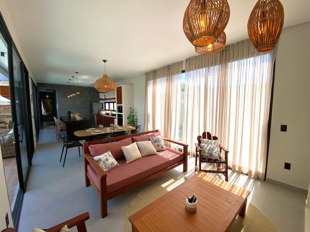 A Casa Céu reúne elegância, conforto e leveza em ambientes amplos, iluminados e naturalmente ventilados. A suíte oferece cama queen-size, ar-condicionado, closet, banheiro com chuveiro quente e um espaço exclusivo para trabalho. A cozinha espaçosa integra-se harmoniosamente a casa e a sala de jantar à noite ganha um clima romântico. O grande destaque é a área externa, com uma banheira rodeada por um lindo jardim perfeita para relaxar e se conectar profundamente com a natureza.