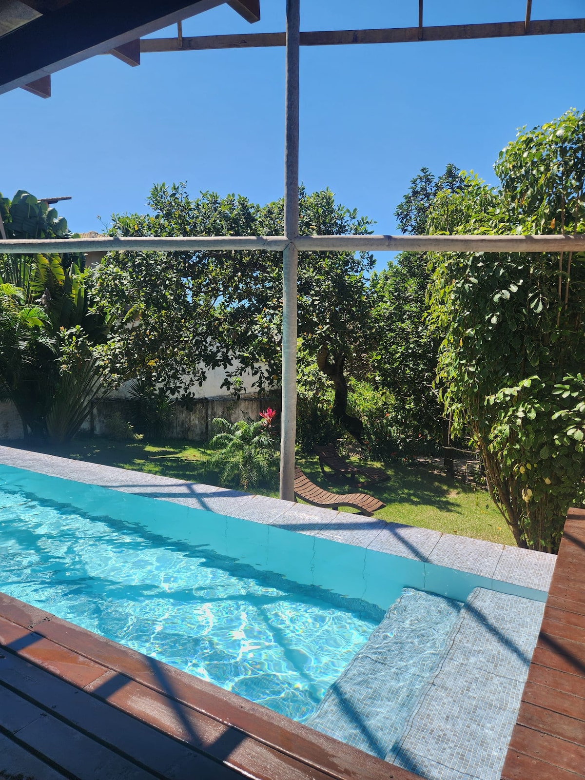Lovely house in a small compound with a SHARED SWIMMING pool, surrounded by a lot of green, with native trees where visitors can appreciate a bit of the local wild life and see things such as beautiful tropical birds and small monkeys. The house is very well located being close to local shops, restaurants and bars and it is only 250 meters from the main beach. O aluguel mensal não inclui a eletricidade, que será cobrada separadamente.