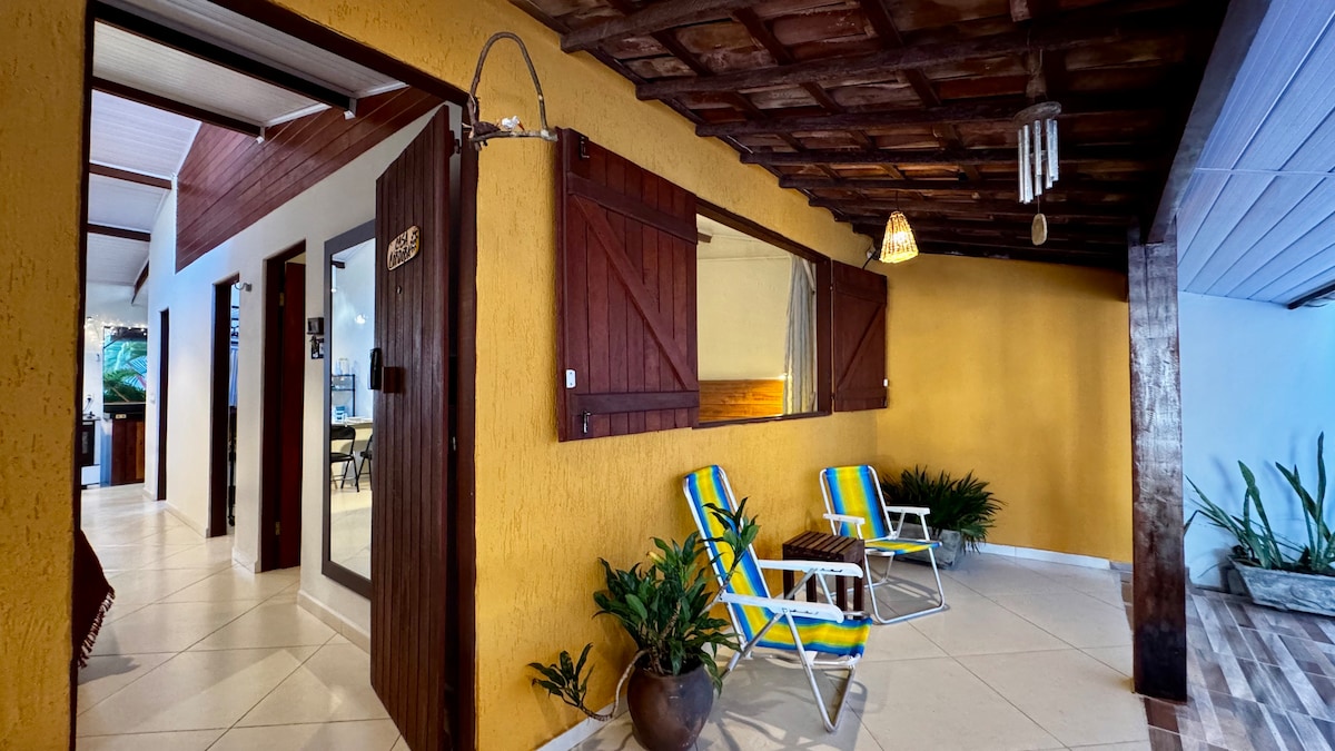 Casa em condomínio fechado e seguro, muito confortável, com vista incrível para o mar. No segundo andar está a suíte principal, perfeita para descansar e aproveitar a paisagem, com ar-condicionado. O segundo quarto funciona também como home office, com cadeira ergonômica e internet fibra de 700 Mb. Cozinha completamente equipada integrada à sala, ambiente acolhedor. Área externa com rede e vista linda. Condomínio com recepção, duas piscinas e estacionamento.