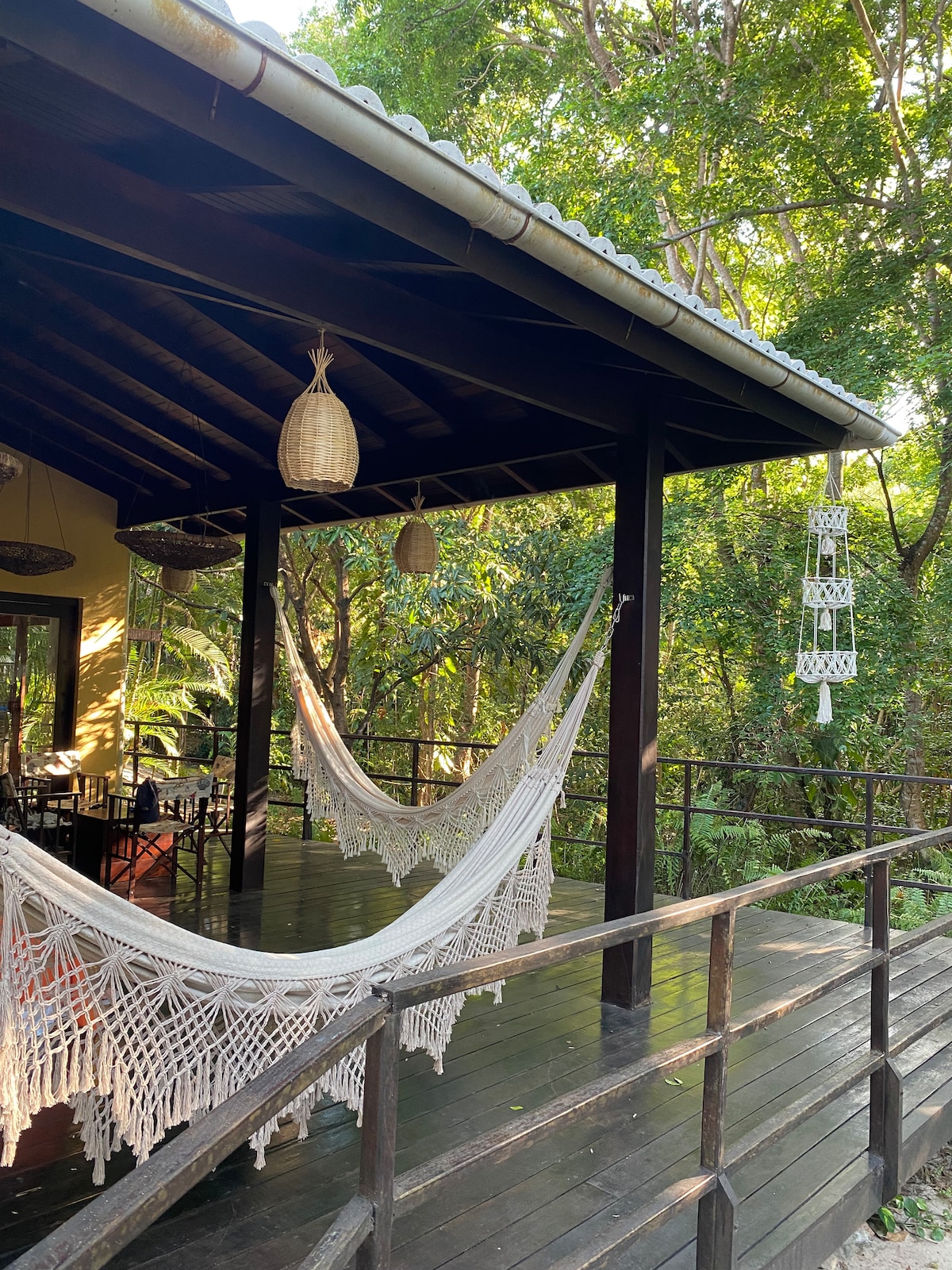 Com portas e janelas em amarelo vibrante, ela traz cor, leveza, energia e aquele astral praiano que combina com dias leves e noites tranquilas. De frente para a mata, você acorda com canto de pássaros, recebe visitas de saguis curiosos e sente a natureza pulsando ao redor. Seu mascote, o tucano, simboliza essa conexão viva com o verde e com o simples. Um refúgio acolhedor para desacelerar, trabalhar, descansar ou simplesmente existir em paz.