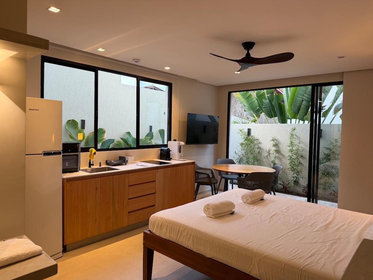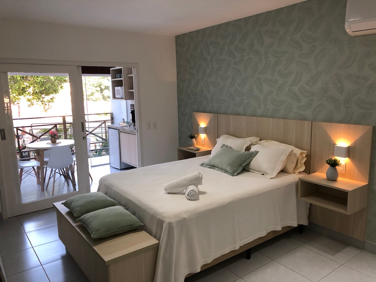 -Flat bem localizado, com duas piscinas e bar ao ar livre na sua cobertura, com vista deslumbrante para o mar. -Melhor localização da Pipa, a beira mar, a 200mts da rua principal, onde se encontram os principais bares e restaurantes da cidade, lojinhas, etc... -Apartamento com espaço para até quatro pessoas. -cama king Size -TV Smart -Sofá-cama -Uma pequena cozinha com microondas, frigobar, pratos, talheres, copos,xícaras e taças. -Liquidificador, cafeteira, torradeira e secador de cabelo.
