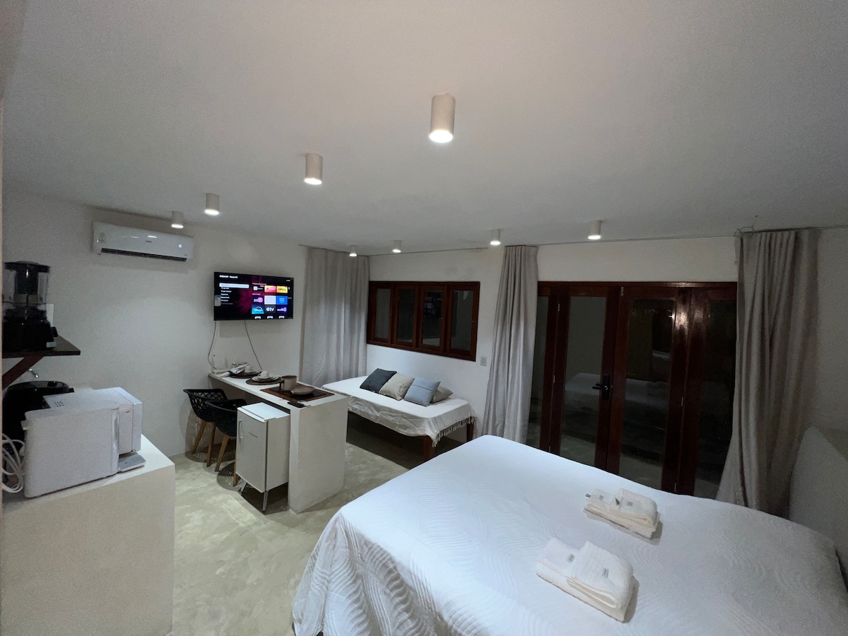 Criada com muito amor, em localização PRIVILEGIADA e cercado de muito verde. Possui cama de casal queen, banheiro chuveiro elétrico, ar condicionado, mini cozinha com frigobar, sanduicheira, cafeteira, micro ondas, perfeito para preparar seu próprio café da manhã e lanches. Possui varanda com mesa, cadeira, rede, jardim e ducha ao ar livre. Bem localizado, apenas 600mt da Praia do Amor, 800mt do Chapadão e 400mt de lavanderias, mercados, farmácia e padaria e da badalada noite da Pipa.