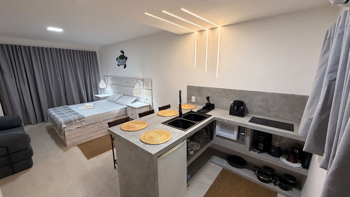 Aconchegante, ventilada e bem iluminada, situada em "Villa La Ribera" um condomínio de 3 casas com amplo quintal, cheio de paz e natureza. Dispõe de ar condicionado, boa internet, escritório com cadeira ergonômica, varanda com mesa, sala com sofá cama, cozinha equipada, 1 banheiro, 1 quarto, 1 pequeno quintal privado e muito conforto ❥ Fica a: 200M da padaria 500M do principal atacarejo 800M da Praia do Amor e do centro Ideal para quem procura um lugar tranquilo, porém de fácil acesso a tudo!