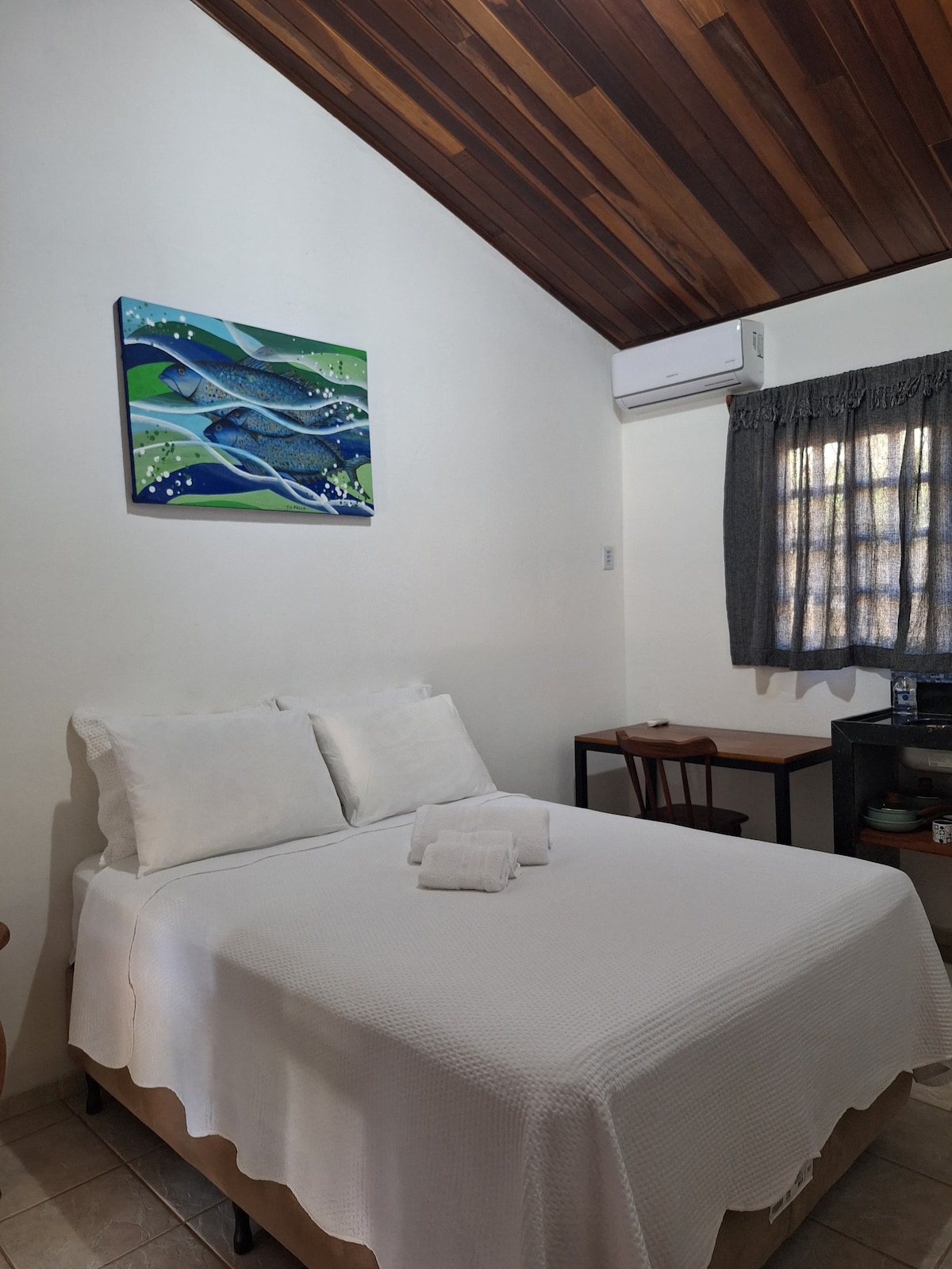 Suíte simples e aconchegante, ideal para quem busca praticidade e uma experiência vibrante no coração de Pipa. A hospedaria cultural está situada no burburinho da vila, a apenas 50 m da Av. Baía dos Golfinhos, perto dos principais restaurantes, comércios e da Praça do Pescador. Residência do casal de fotógrafos Michelle e Gustavo, que trabalham com audiovisual. Planeta Pipa.