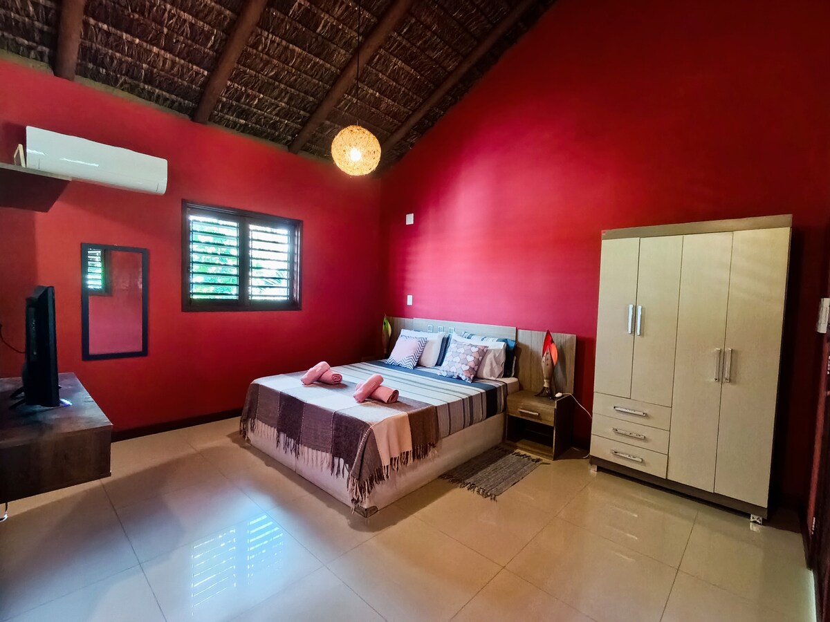 Suíte especialmente para casais, localizado em área super arborizada e tranquila, suíte com cama queen, ar condicionado, frigobar, TV, banheiro bancada pia dupla com chuveiro quente e varanda. Espaço para relaxar com uma fonte no jardim. Para uso comum, espaço lazer com grande mesa, som, freezer, churrasqueira, fogão, banheiro e um chuveirão externo. Distância do centro (e praia) 1km, Praia do Amor 1,5km, Praia do Madeiro 3,5km.