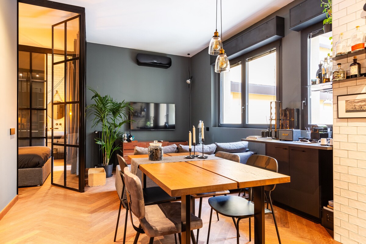 An industrial loft with contemporary character in the heart of Porta Venezia, featuring a spacious private terrace and thoughtfully designed interiors full of atmosphere and personality. Black steel glass partitions, warm materials and soft lighting create a refined yet authentic space, ideal for experiencing Milan in style and comfort. Quiet and private, yet just steps from the vibrant heart of the city.