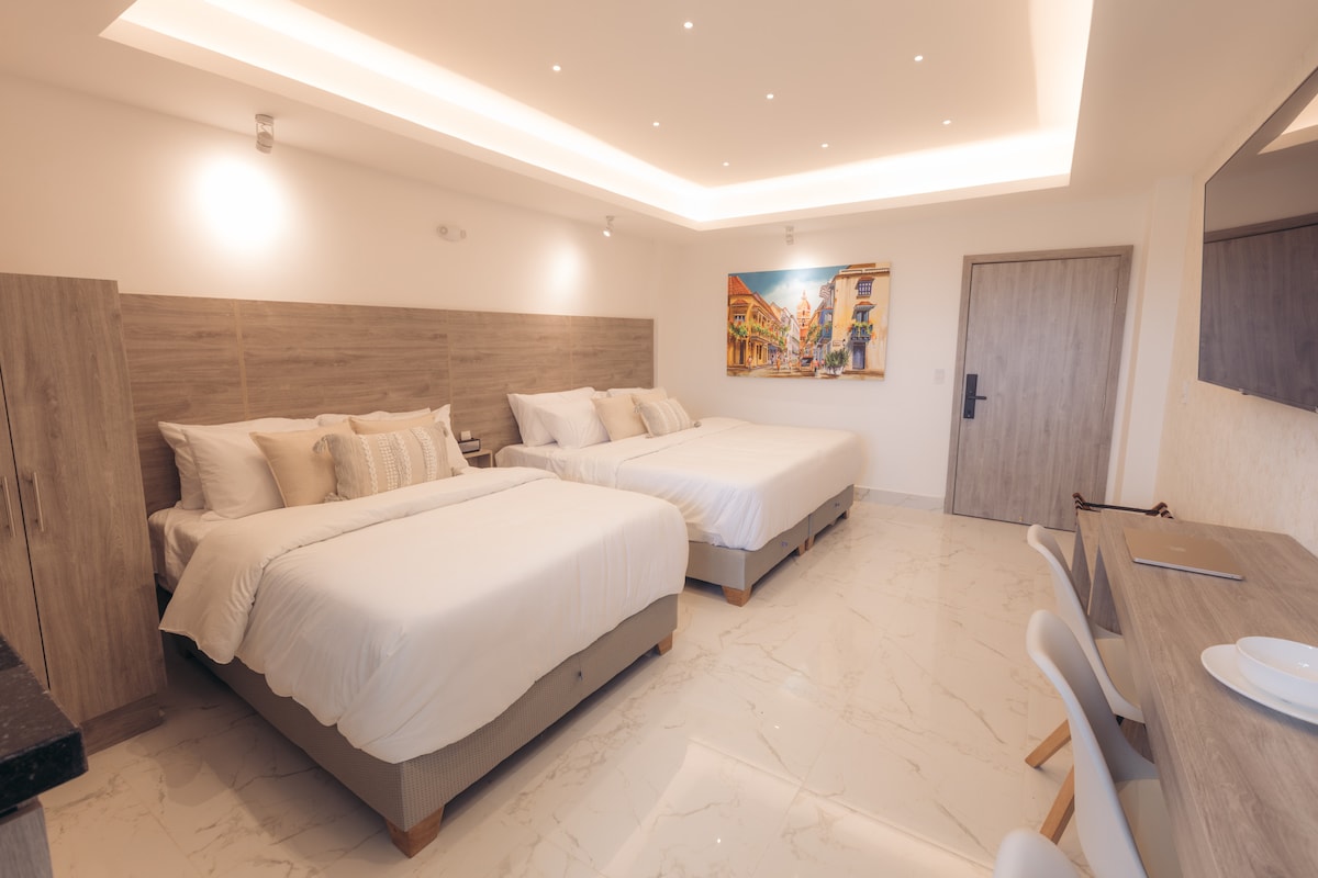 Apartamento nuevo con vistas al Centro Histórico de Cartagena y el Mar Caribe, perfecto para 6 personas. Cuenta con 2 cuartos, 2.5 baños, cocina completa, aires acondicionados, internet fibra óptica y Smart TVs. A solo 2 minutos del Centro Histórico. El edificio ofrece piscina infinita, jacuzzi, gimnasio, coworking, salón social y recepción 24/7. Como Superhost con 5 años de experiencia, te garantizo una estadía cómoda y sin preocupaciones. Ideal para estadías cortas o largas.