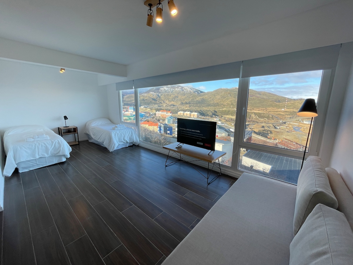 Extraordinario Studio, con Cama Matrimonial (o dos camas) mas un sofa cama con cama marinera, ofrece una capacidad maxima de 4 pasajeros, ideal para familias con niños. Cocina comedor integrada, vajilla completa. Baño con Bañera. Tv Smart e internet de alta velocidad. Desde su enorme ventanal podras apreciar en primera fila del majestoso Canal Beagle y sus islas. El complejo dispone de servicios sin cargo para huespedes: Lavadero, Sum, Locker, porta esquies sin cargo y Spa (con costo).