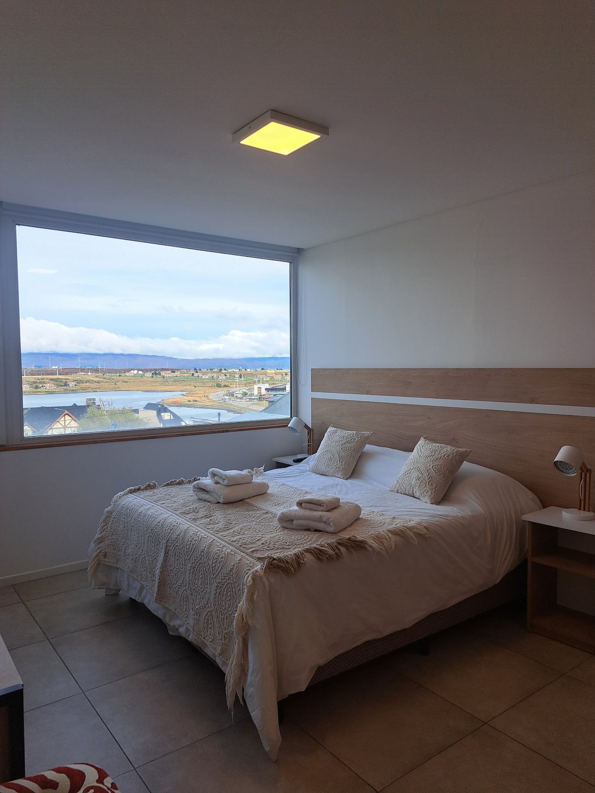 The best view of the world's end. Great view from bed room and Iiving room. New apartment, fully furnished in a perfect location. Just 300 meters from San Martín (main street). Early check in at 8 am included. Late check out at 4 pm included. Radiant slab. Electrical stove. Microwave. Washer dryer. Wifi Internet included. Two smart tv. Towels included. Toilet paper and soap included just for the first day.