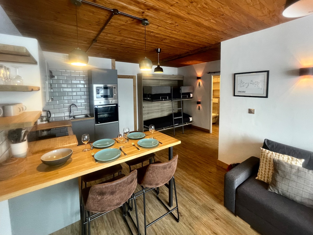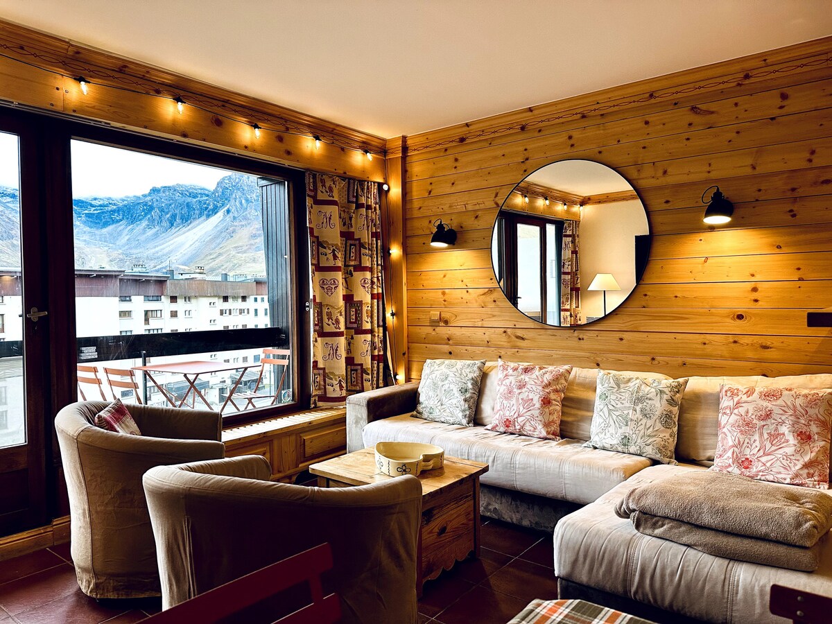 Rented apartment for 2 persons 35 m² in Tignes Val Claret (Schuss building) located on the 5th floor with elevator in a quiet residence, close to shops and slopes. The most of this apartment : a warm Scandinavian decoration and very well equipped. Corner balcony with a breathtaking view of the Tignes Lake and the Aiguille Percée. It is located at less than 5mn from the ski starts with a possible return on foot. Household linen is included in the "cleaning fee".