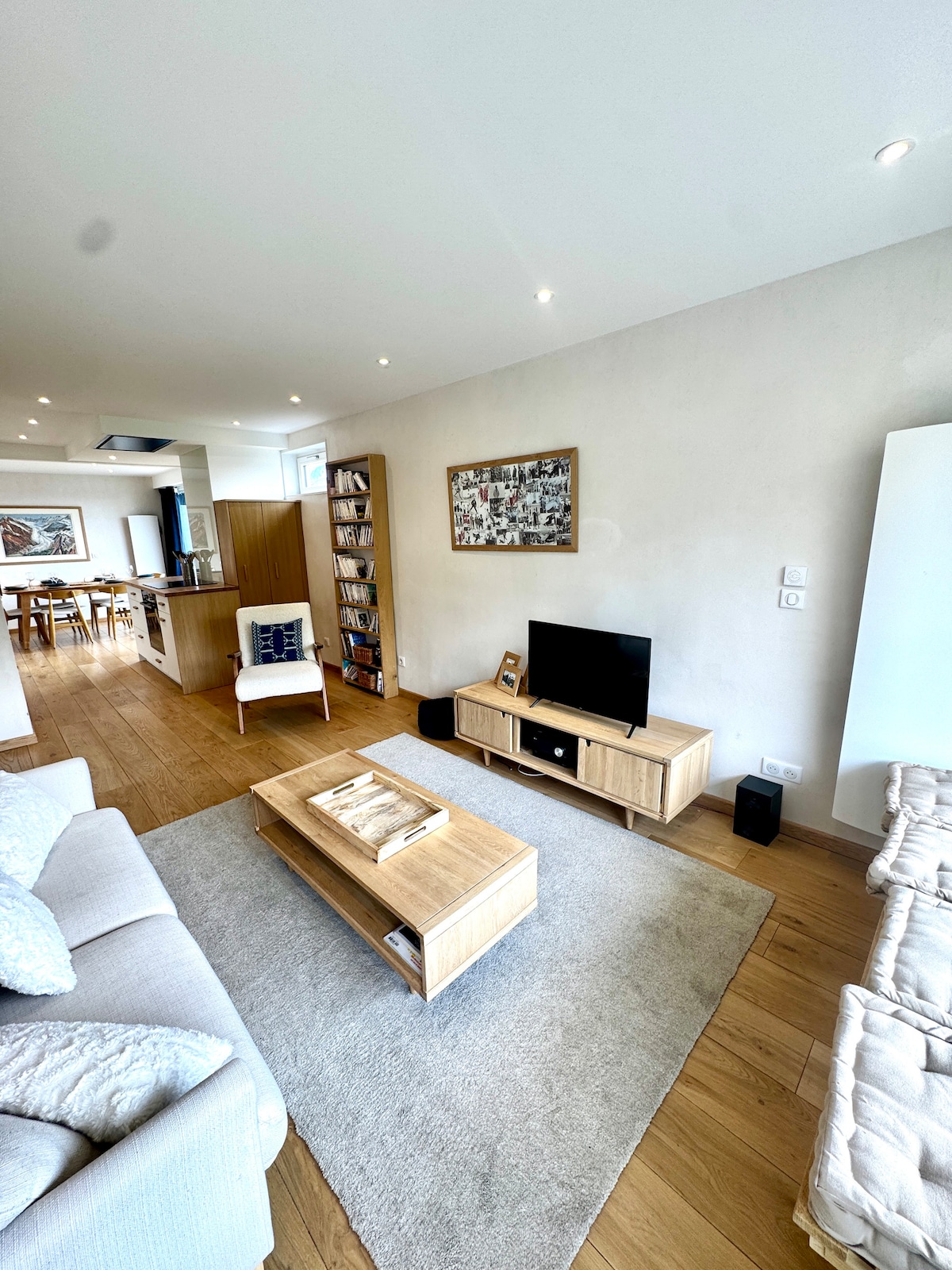 1 bedroom apartment + cabin, at the entrance of Tignes Val Claret Centre, just a 5-min walk (450m) from the slopes. Refined comfort with stunning mountain views, elegant design. 🛌 Sleeps 6 with separate sleeping areas: • Queen bedroom (160x200) • Cozy mountain cabin with 2 bunk beds (60x190), ideal for children • Living room with convertible sofa bed (140x200) 🧺 Bed linen and towels are available on request (extra fee). Baby cot on request (extra fee).