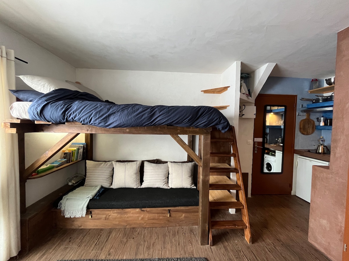 Studio rénové avec soin, esprit chalet, COSY avec VUE IMPRENABLE sur le lac du Chevril. Tignes 2100 m Lavachet. Studio 22 m² 4 pers, IDEAL couple avec 2 enfants NON ADAPTE POUR 4 ADULTES. Situé à côté du départ des pistes, de vtt et de rando, navette gratuite à 50m, commerces et resto à proximité. (Sherpa, boulangerie, bars, location, achat forfait) Dernier étage (9ème) ascenseur. Porte séparant l'espace nuit avec convertible 140, 1 lit superposé en 80 WIFI par la fibre gratuit. Casier à ski