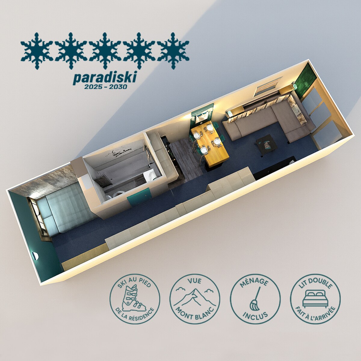 Agréable studio de 25m², pour 4/5 personnes, calme et sans vis-à-vis, au 4ème étage avec vue sur la chaîne du Mont-Blanc et la forêt, balcon orientation Nord, idéal pour une famille. Classé Quatre Cristaux Paradiski, il est situé au cœur de la station piétonne des Arcs 1800, dans le village du Charvet, à 50 mètres de la gare routière du Charvet, très proche de tous les commerces, restaurants et des caisses d'achat de forfaits. L'accès aux pistes et le retour se font skis aux pieds.