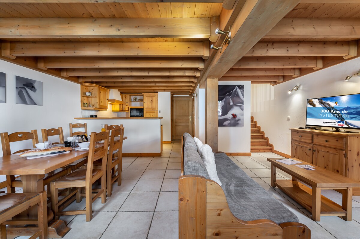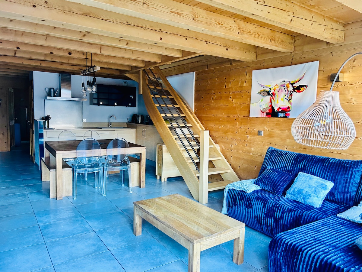 Appartement spacieux (50m2) pour 4-5 personnes, ambiance chaleureuse type chalet de montagne. Baies vitrées tout le long de l’appartement donnant sur un balcon avec vue sur les sommets environnants . Literie de qualité, et équipements complets, modernes et haut de gamme: (nespresso, audio Jamo, écran plat, appareils à raclette, pierrade, fondue, lave vaisselle , lave linge , Dyson , etc) Parking couvert privé et casier à ski , Accès piste à 100m et centre de la station 200 mètres .