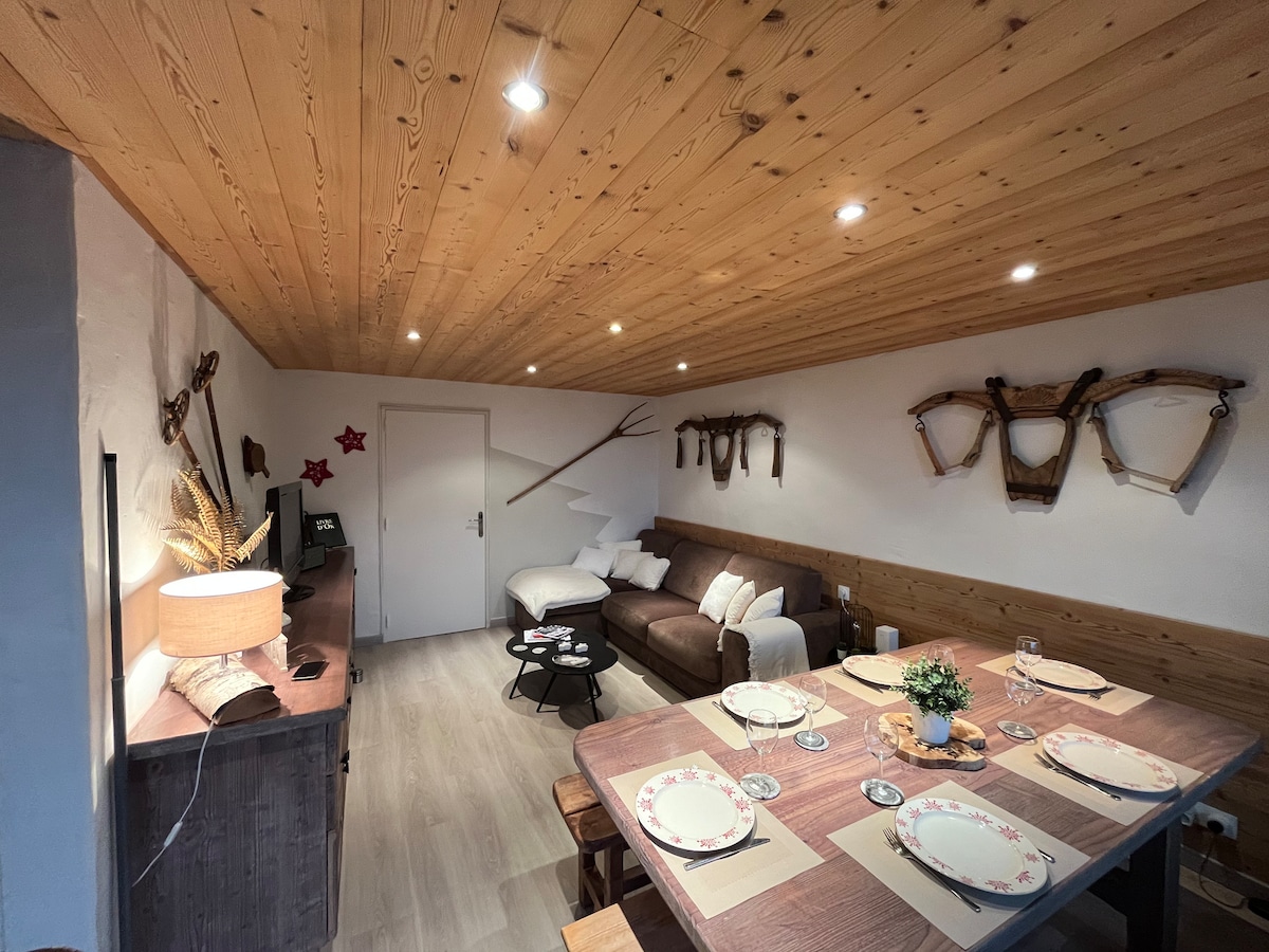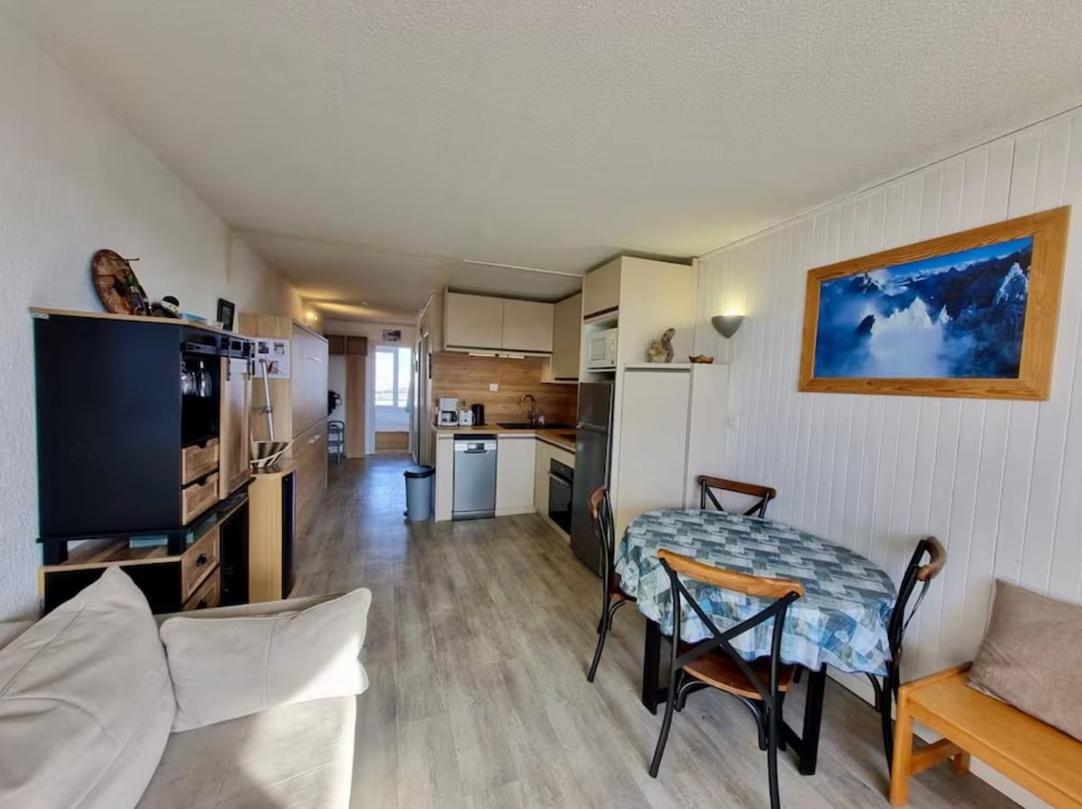 Bel appartement de 30m² pouvant accueillir 5 personnes. Cuisine ouverte, salon avec coin repas, une chambre, deux coins nuit, sdb, wc séparés. L'appartement bénéficie d'un grand balcon exposé sud ouest avec une jolie vue. Situé au 2éme étage avec ascenseur, au cœur de la station, départ et retour ski aux pieds. Appartement non fumeur. Casier à ski. Parking inclus.( Hauteur max 1m90) Ménage inclus. Location de linge possible 20€/pers (linge de lit, serviette toilette, tapis sdb)