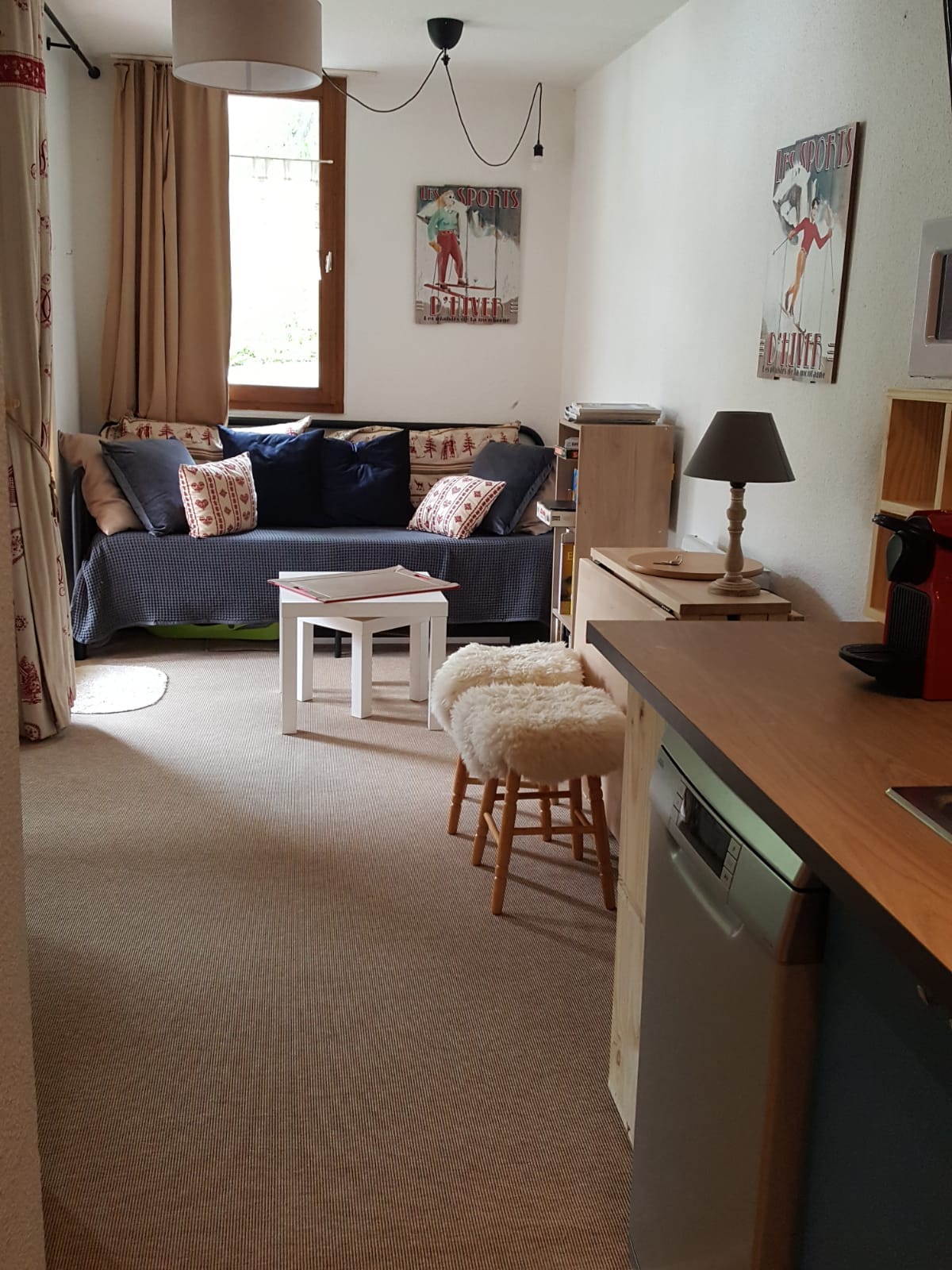 Ce logement paisible offre un séjour détente pour toute la famille. Le logement se compose de deux chambres, une chambre double dans un esprit « cabane », et une deuxième lit jumeaux, dans un esprit « forêt « . La deuxième chambre peut être transformé en lit double sur demande. La pièce principale, cuisine/salon et sa cheminée électrique vous accueillera après une journée de balade, de ski, ou de découverte. L’accès à l’appartement se fait par un escalier métallique, logement non pmr.