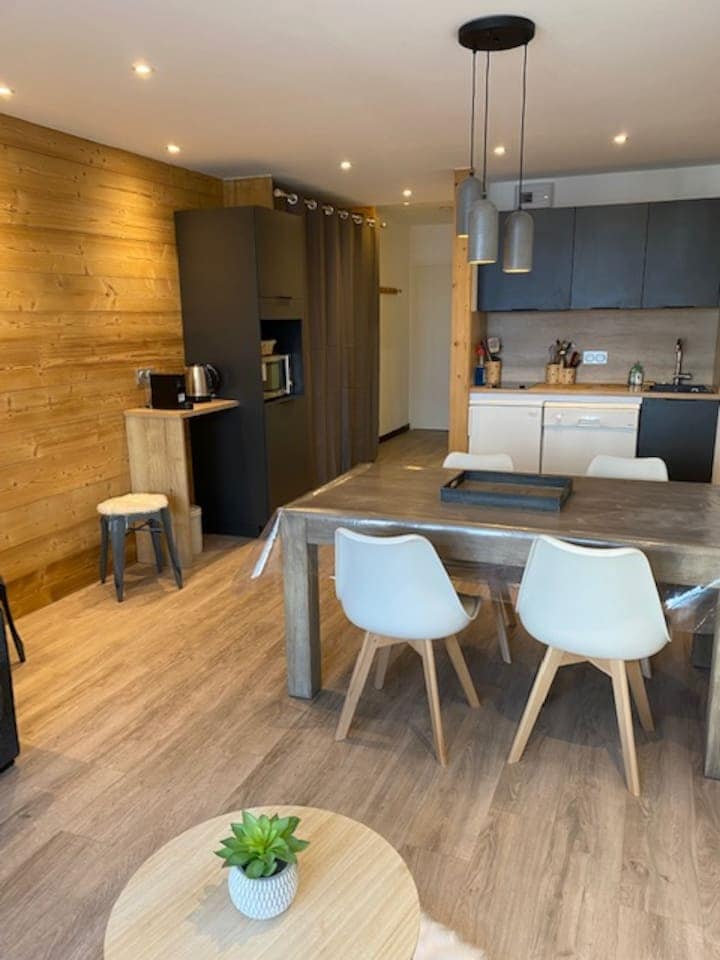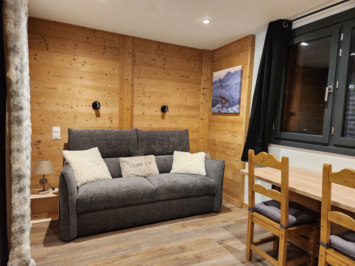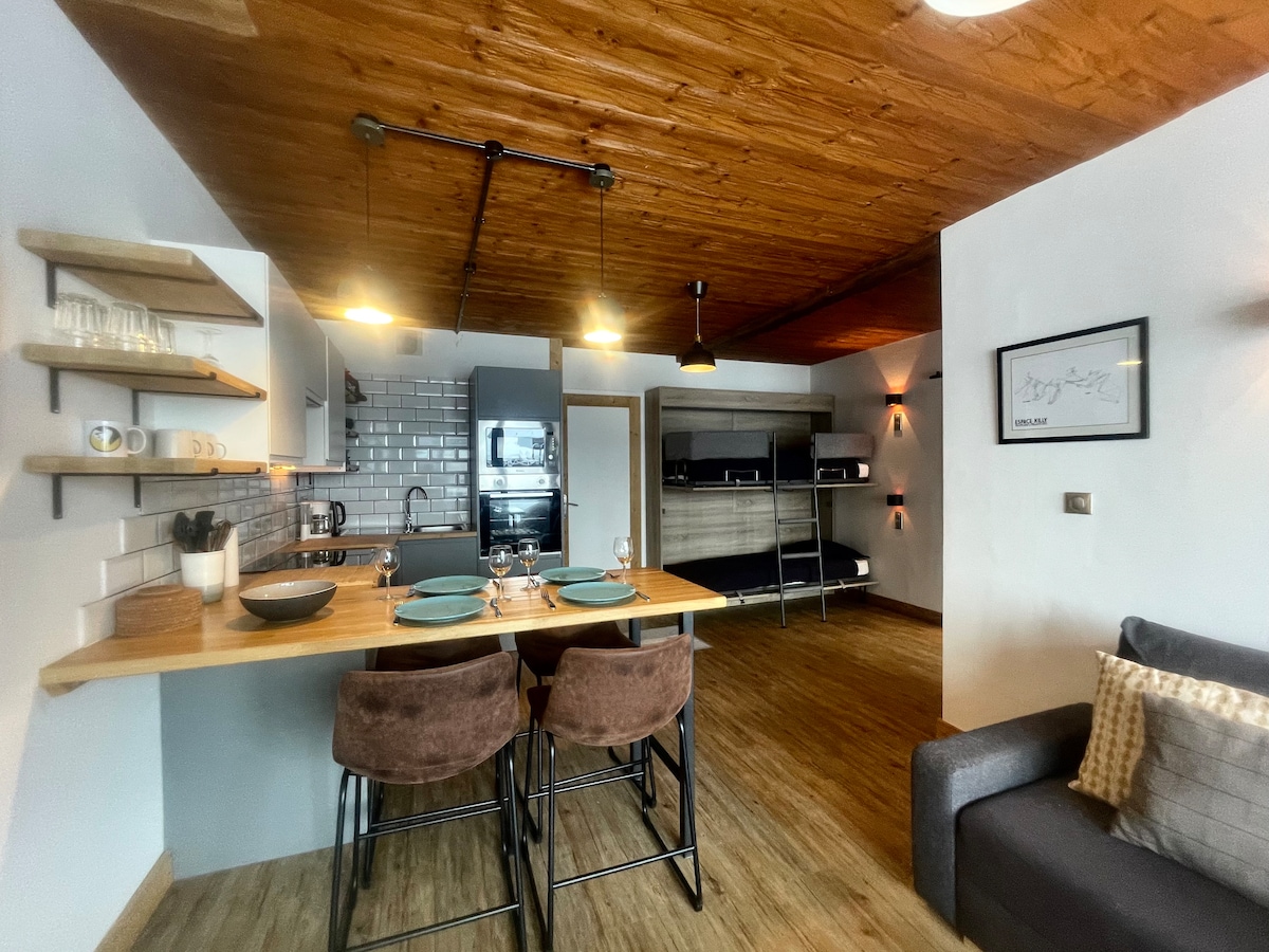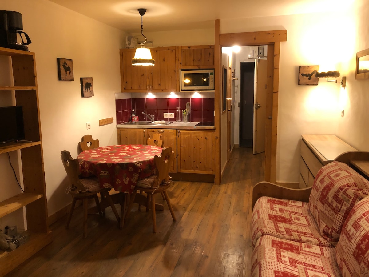 Studio cabine refait à neuf de 17m2, idéal 2 personnes, mais peut accueillir 4 personnes Il dispose de 4 couchages, un canapé lit double dans le salon, et 2 lits escamotables dans l'entrée A 2min à pieds des remontées mécaniques(150m) et proche de tous commerces, un arrêt des navettes gratuite est juste en bas de la résidence L'appartement dispose d'un lave vaisselle, cafetière, grille pain et bouilloire, ainsi que d'un casier à ski Les draps, serviettes et le ménage sont compris Wifi gratuit