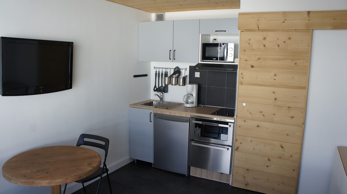Studio lumineux vue montagne. Grand balcon avec table et chaises Entrée avec lits superposées de 80, placard,Salle de bain sèche serviettes, sèche cheveux WC séparés. Séjour avec lit gigogne, une banquette,télé,placard,Kitchenette, four, four micro-ondes, plaque vitro, lave vaisselle, grille pain, cafetière filtre et senseo, bouilloire, mixeur,appareil fondu,raclette. Casier à skis chaussures. Parfaitement situé dans quartier calme. Navette gratuite, boulangerie, superette, restaurant, bar......