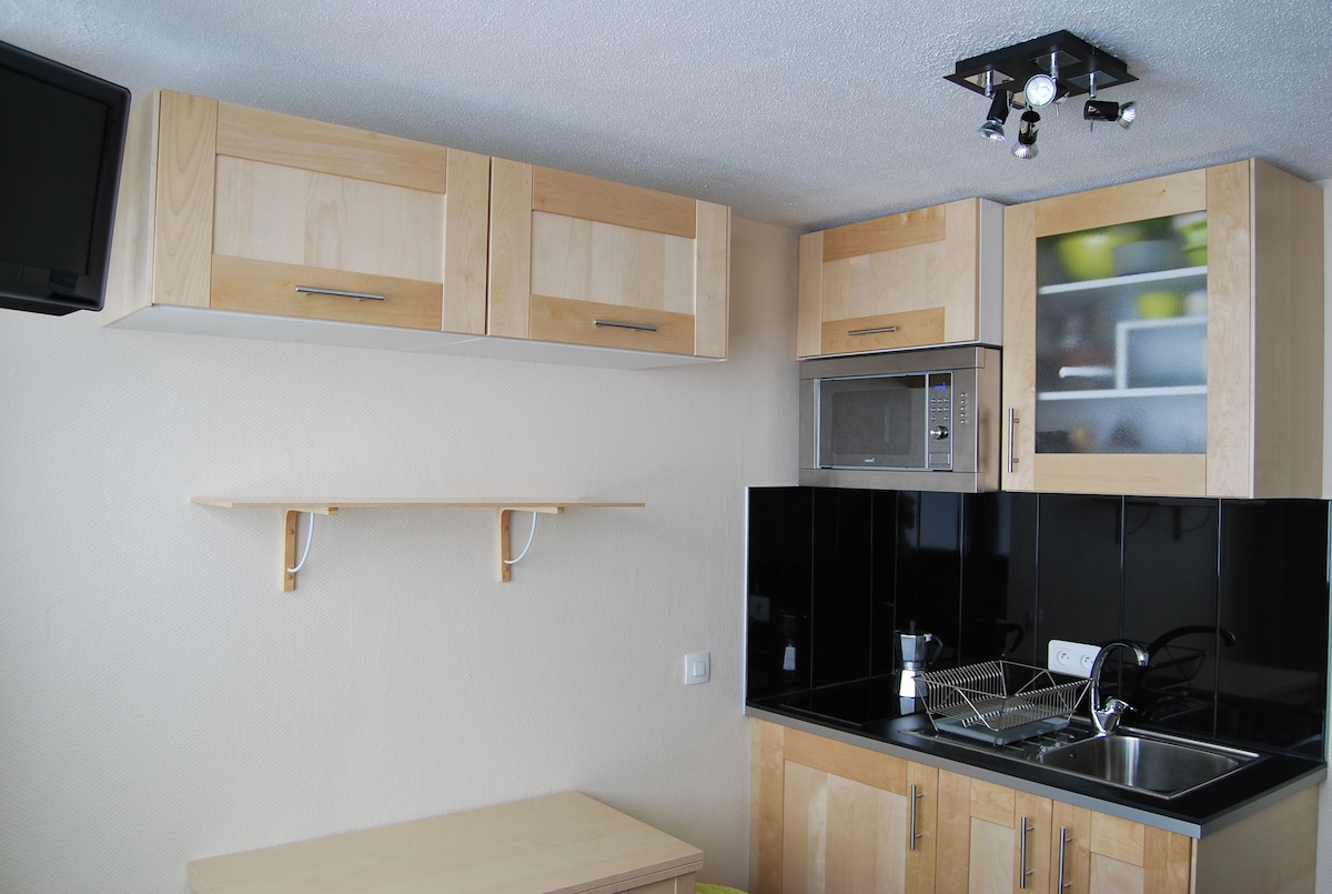 Studio lumineux vue montagne. Grand balcon avec table et chaises Entrée avec lits superposées de 80, placard,Salle de bain sèche serviettes, sèche cheveux WC séparés. Séjour avec lit gigogne, une banquette,télé,placard,Kitchenette, four, four micro-ondes, plaque vitro, lave vaisselle, grille pain, cafetière filtre et senseo, bouilloire, mixeur,appareil fondu,raclette. Casier à skis chaussures. Parfaitement situé dans quartier calme. Navette gratuite, boulangerie, superette, restaurant, bar......