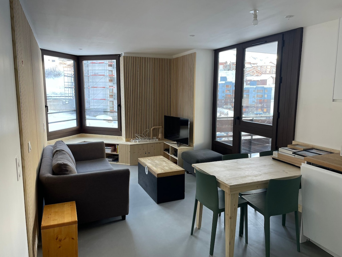 Profitez d'un logement élégant et central. Très beau studio 9 ème étage, plein sud, au pied des pistes. Décoration moderne qui optimise les espaces. L'appartement se situe dans l’immeuble le Palafour, c’est l’immeuble le plus central de la station : vous partez skis aux pieds, vous revenez skis aux pieds, Vous êtes aussi au plus près des départs de cours de ski, des commerces, bowling, espace bien-être et piscine.