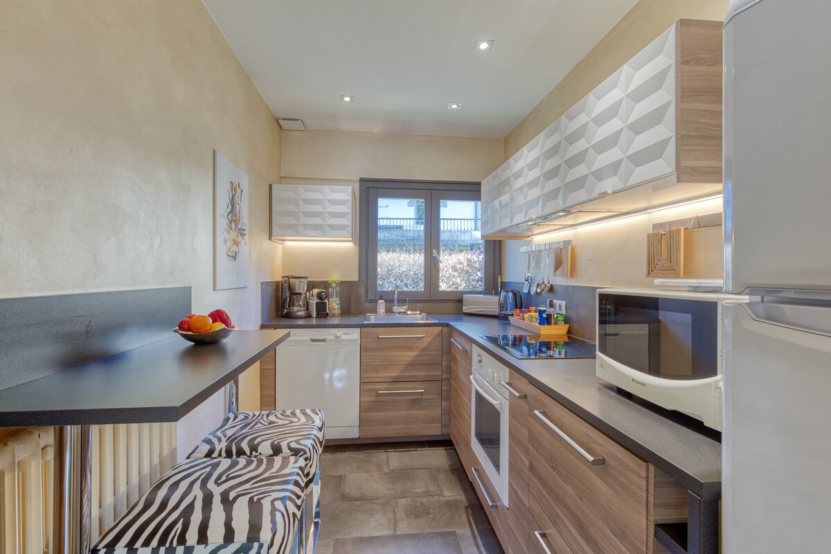 Nous sommes heureux de vous accueillir dans notre adorable petite maison/ ancienne remise maçonnée entièrement rénovée et réaménagée avec soin mi 2021. Belle terrasse sud ombragée l’après midi, vues vraiment magnifiques et dégagées vers le Mont- Blanc, les aiguilles de Chamonix, « au pied » du glacier des Bossons en face. En retrait de 20m de la route dans un quartier résidentiel. Transports à 2 pas. 2 places de stationnement devant la maison. Wifi. Pas de TV.