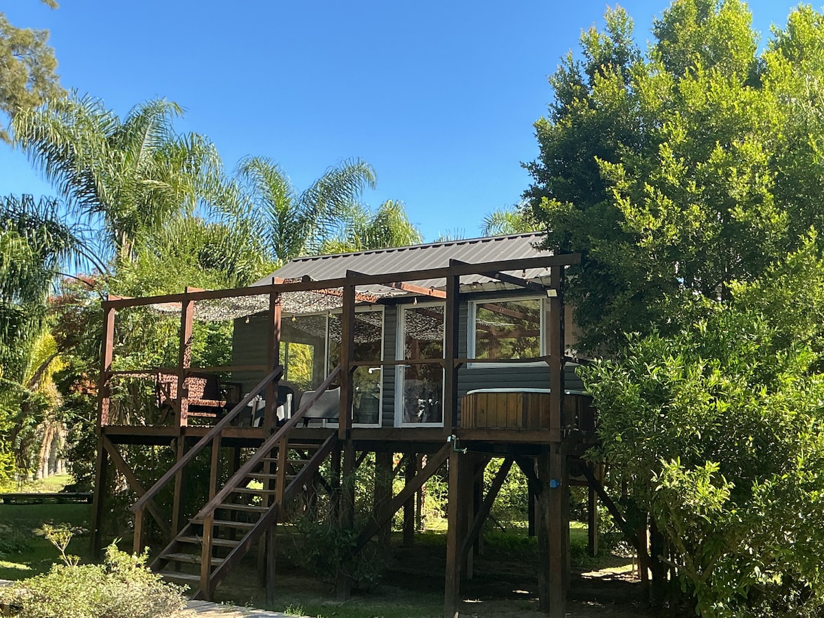 (ecocabanario) Ubicada a 10 min en lancha desde San Fernando, te encontrarás en un espacio de relax y armonía en medio del verde. Pileta privada. Kayak doble, deck con parrilla, mirador propio a 9 mts de altura con vista a las copas de los árboles, A.A. F/C, Smart TV 50” con Netflix, Wi-Fi, cocina completa con heladera y freezer, horno eléctrico, anafes y todos los utensillos de cocina necesarios, ropa blanca, secador de pelo, shampoo, acondic y jabón Solo 2 pax No se admiten niños ni mascotas
