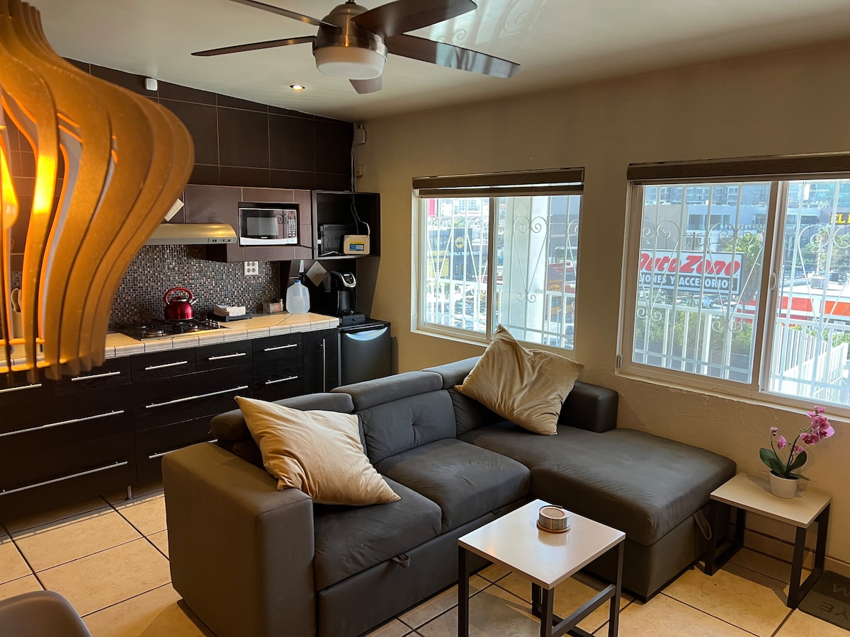 Welcome to Tijuana! Discover comfort and convenience in our small but cozy 1-bedroom apartment. With a fully stocked kitchenette, mini split A/C, and Smart TVs, relaxation is at your fingertips. Enjoy fast Wi-Fi (100 Mbps) for seamless connectivity. Located in Tijuana's vibrant gastro district, indulge in culinary delights just moments away. Only 5 mins to CAS and 10 mins to the border, our prime location offers easy access to city attractions.