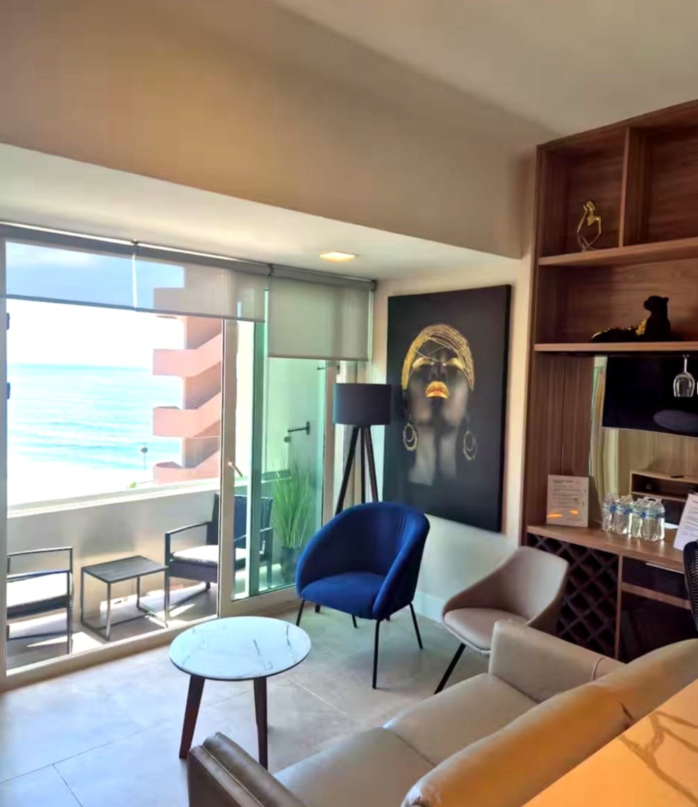 Departamento acogedor con vista al mar, ideal para dos personas. Decorado en tonos suaves y cálidos, ofrece un ambiente relajante acompañado del sonido de las olas. Cuenta con cama Queen size, cocina equipada y balcón privado para disfrutar de atardeceres y momentos de descanso frente al mar. Ubicado en una zona residencial tranquila, es ideal para quienes buscan privacidad, descanso y seguridad. El edificio ofrece alberca climatizada y jacuzzi de uso compartido. No es adecuado para niños.