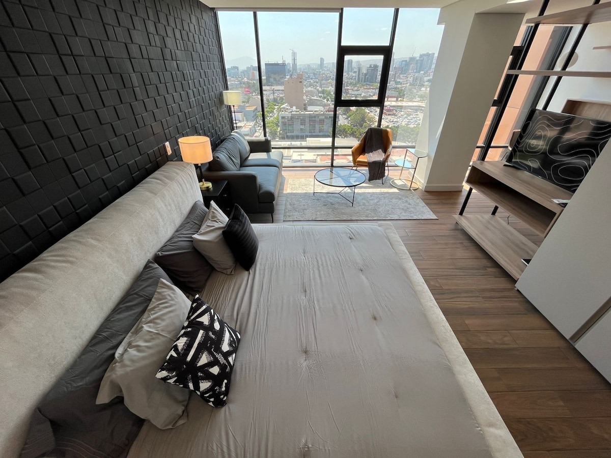 Enjoy a unique experience in our exclusive studio penthouse, with stunning panoramic views of Tijuana and the Xolos stadium. This private retreat offers security, tranquility, and a modern design that combines luxury and comfort. Located in the prestigious Golden Zone, you'll have everything at your fingertips for an unforgettable experience. Plus, you'll have access to the pool to enjoy refreshing moments. Perfect for business, leisure, or getaways. Sleeps 2-3. Enjoy your stay!