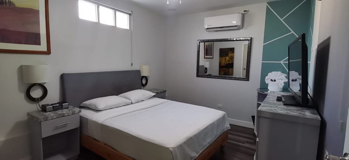 La ubicación está cerca del aeropuerto, las plazas y lo más buscado por los viajeros la embajada de EE.UU. consulado. Vista es una habitación elegante, amplio, moderno y limpio. Tiene una cama king size, colchón muy cómodo, Wifi rápido, televisor inteligente de 45” con Netflix, etc. Cama moderna, dos mesas de noche, comedor de cristal con dos asientos, Nevera pequeña para comida y botanas, Aire condicionado, Agua C + F y una ducha estilo rainfall.