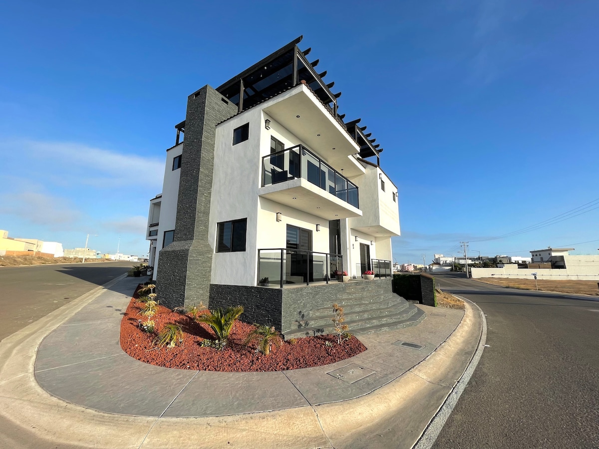 Welcome to Villa Blanca, a truly unique and spectacular destination featuring 180-degree ocean views, located in the heart of Rosarito. The villa boasts a contemporary design and offers a high level of security and comfort for your stay. The entire property is completely private for your group. Situated in a gated community, we provide 24/7 security, with patrols conducted throughout the night to ensure your safety.